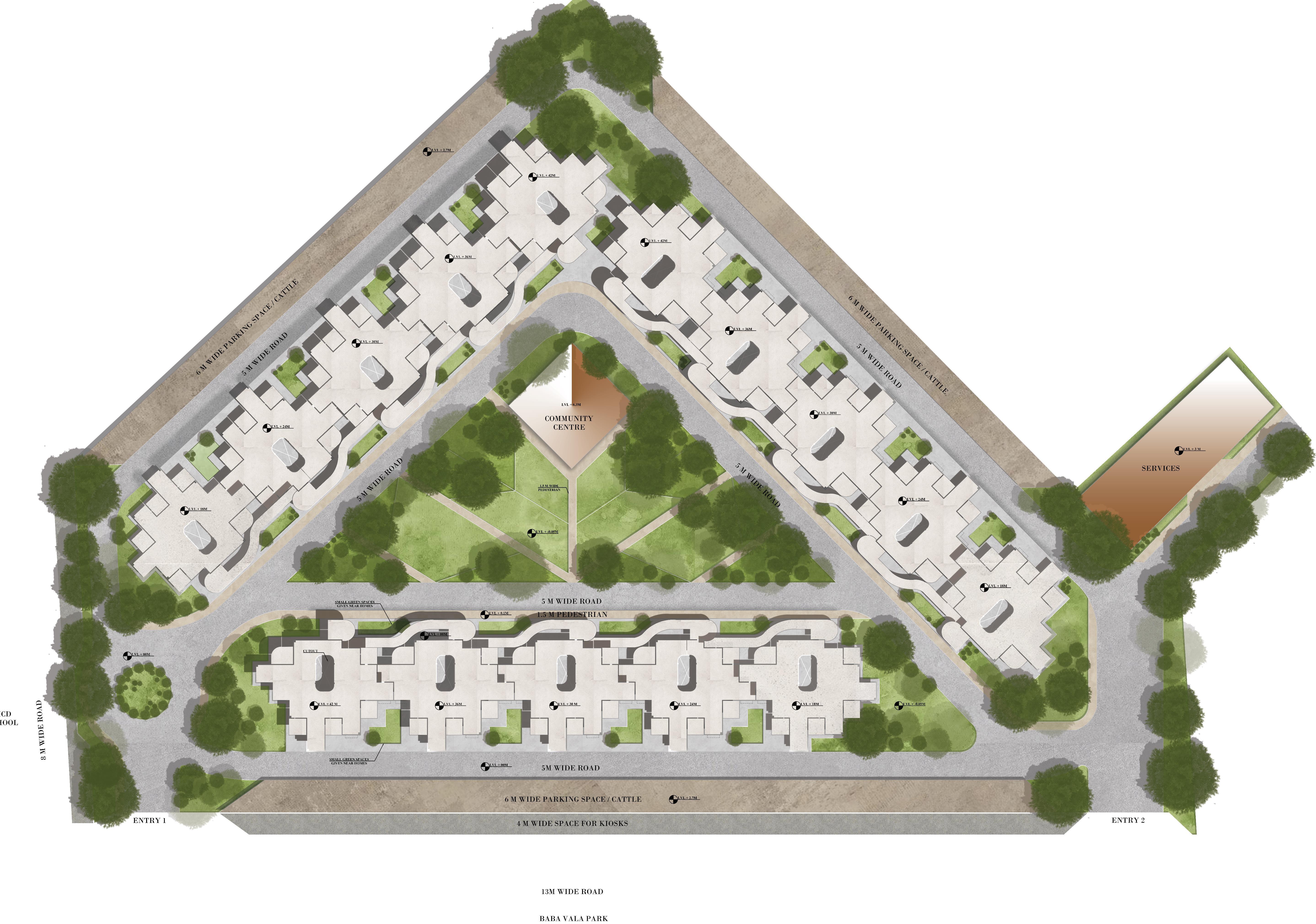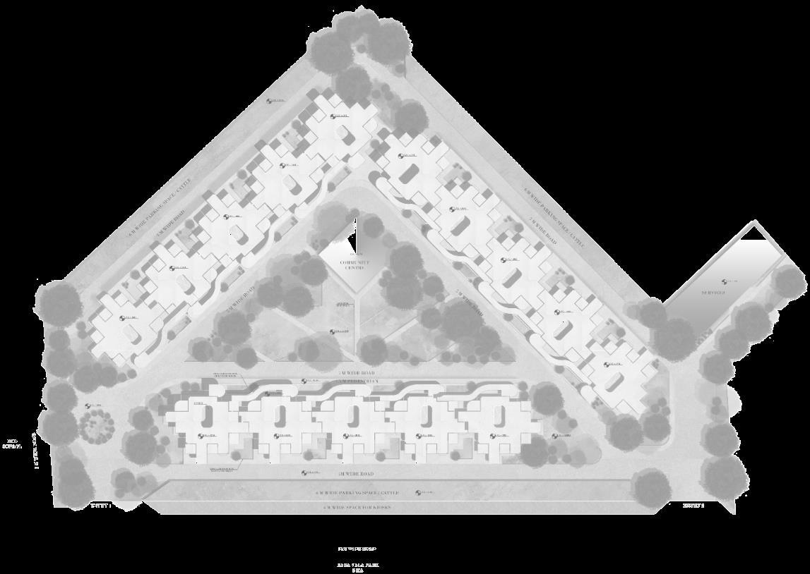 SHAPED LIKE ATRIANGLE, SERVESAS THE HEART OF THE COMMUNITY CENTER. IT FEATURESAVARIETY OF FLOWERING TREES, LIKE THE VIBRANT GULMOHARAND GOLDENAMALTAS, PROVIDING YEAR-ROUND COLOR. SHADED TREES LIKE JAMUN, KADAM,AND NEEM OFFERACOOL RESPITE FROM THE SUN. SMALLER PLANTSAND SHRUBS, SUCHAS LANTANA, OLEANDER,AND DURANTA,ADD POPS OF COLORAND TEXTUREAROUND THE BUILDING. WALKWAYS CONNECT DIFFERENTAREAS,AND BENCHES PROVIDE SEATING FOR RELAXATIONAND SOCIALIZING. THE PARKING SHED IS COVERED IN JASMINE, BOUGAINVILLEA, MADHUMALTI, AND PASSION FLOWER, CREATINGABEAUTIFUL, FRAGRANT ENTRANCE.