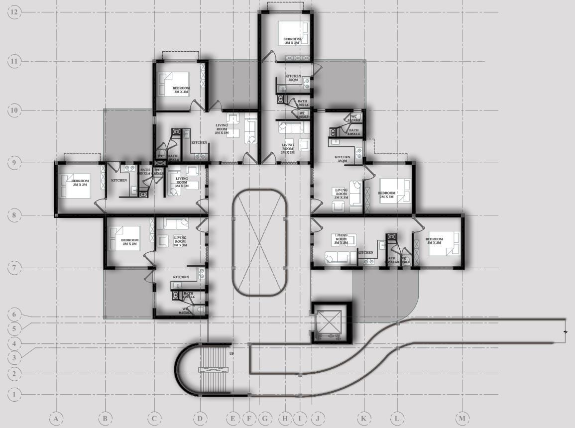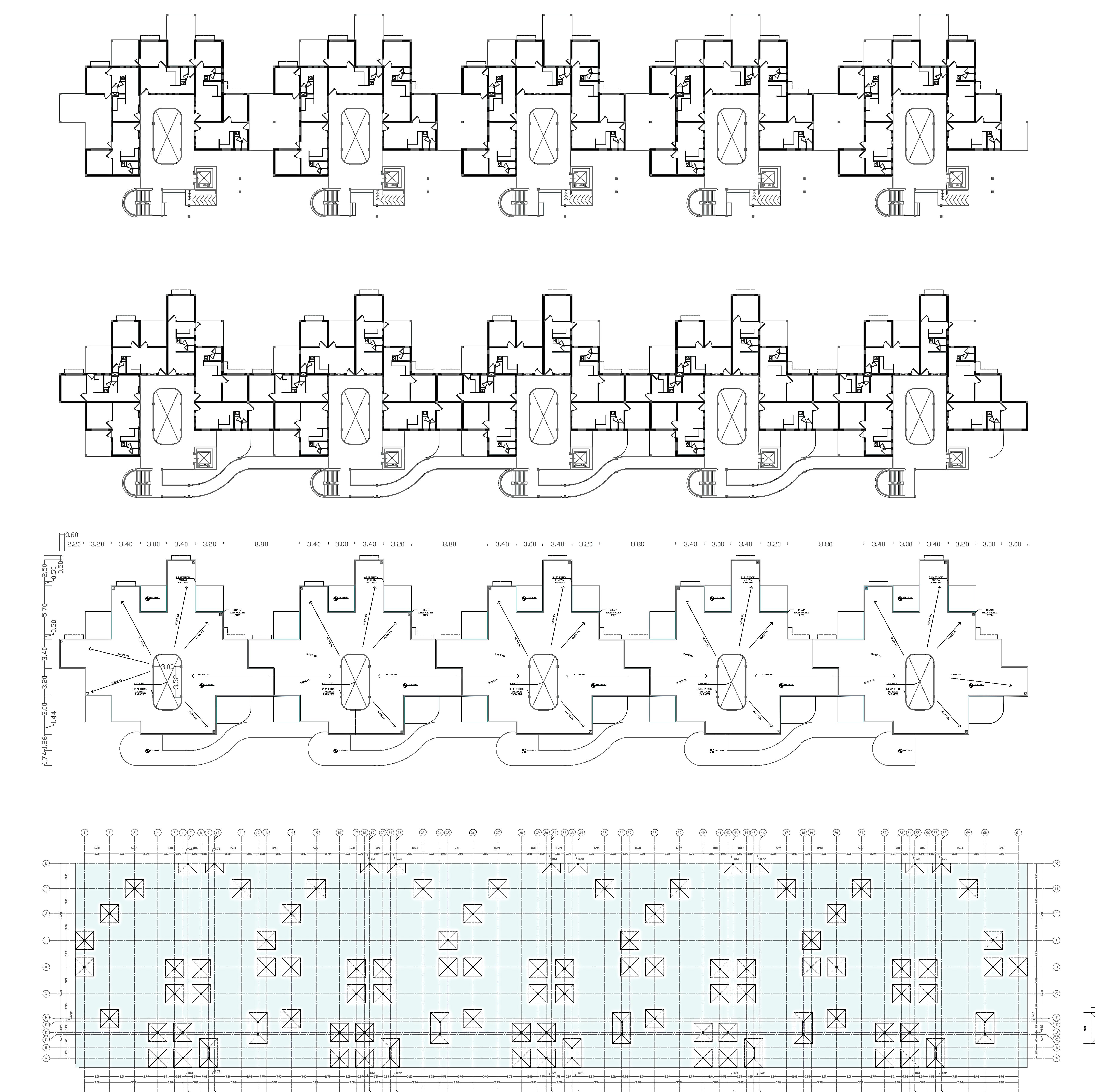 Adescription of floor plan, incorporating the alternating modules: "The architectural design features a dynamic interplay between two distinct floor plan modules, creating a visually engaging and varied living experience. The ground floor module comprises five units per module, while the first-floor module offers six units per module, providing a balance of spatial arrangements. This alternating pattern continues throughout the building, with the second floor mirroring the ground floor's layout and the third floor echoing the first floor's design. This repetition of modules creates a rhythmic and cohesive aesthetic, while the variation in unit count adds a layer of complexity and interest to the overall structure."