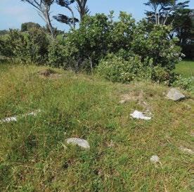 Perhaps the most remarkable features of Kou are the scarps revetted by round river boulders which occur throughout the site. This method of maintaining steep scarps in the light volcanic soils is known elsewhere in Taranaki, for example at Ngaweka on the south bank of Stoney River and Tapuīnikau on the Teikaparua River, but nowhere is ·the work as spectacular as at Koru. It is, however, likely that the stone revetments have suffered some erosion over the years as the 3 m height of such walls depicted by Best (1975:210-211) cannot be found today. Smith (1910:258) mentions such walls up to 15 feet (4.5 m) high. The greatest height of such work to have survived is about 2 m; debris at the foot of higher scarps locates Best’s illustrations. The stone revetment is mostly used simply to face scarps; in places, however, it is used to face defensive walls (notably on the riverbank at the north end of the site), and to hold the sides of sunken pathways.
