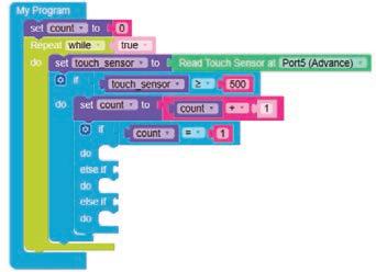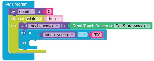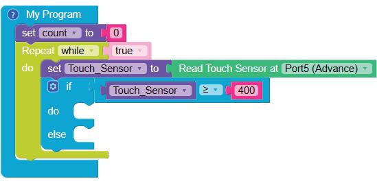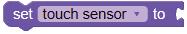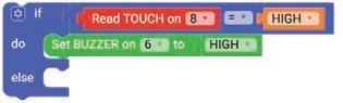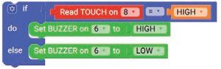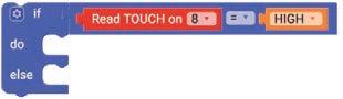 5. Drag the Read TOUCH on block from the SENSORS category and drop it in the left part of the equal operator block. Set the pin number to ‘8’.
