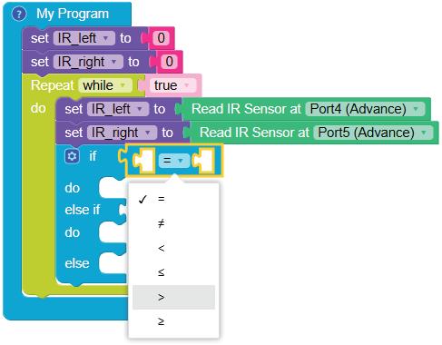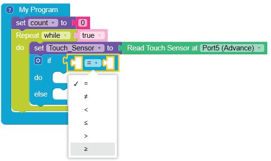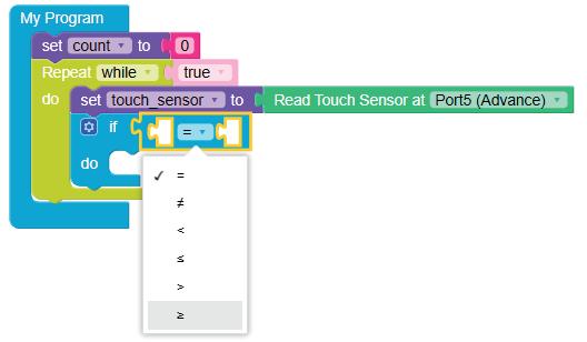 7. Select greater than or equal to option from the drop-down of the equal operator block.