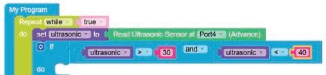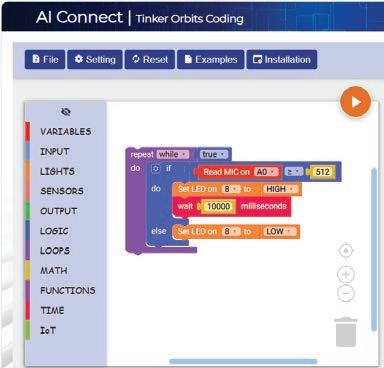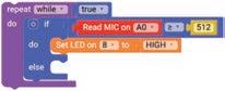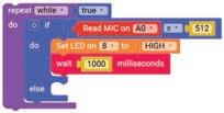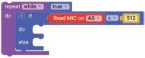 8. Drag the Read MIC on block from the SENSORS category and drop it in the left part of the greater than or equal to operator block. This block is set to pin number A0 by default.