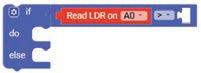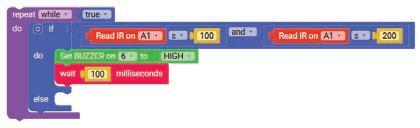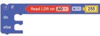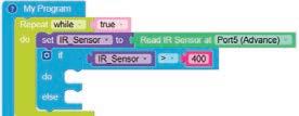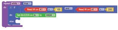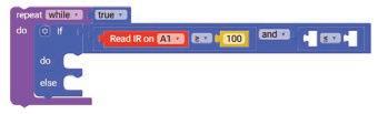 8. Drag the Read IR on block from the SENSORS category and drop it in the left part of the '<' (less than) operator block. Select A3 from the drop-down of the block.