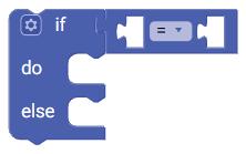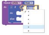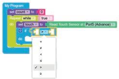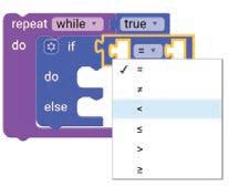 8. Click on the settings icon again to close the pop-up box. 9. Drag the equal operator block from the LOGIC category and attach it to the if block. 10. Select less than or equal to (≤) block from the drop-down of the if block.