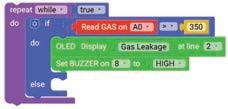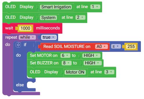 17. Drag the OLED Display block from the OUTPUT category and drop it below the Set BUZZER on block. Select ‘3’ for line from the drop-down of the block. Type ‘Motor ON’ in the TEXT part of the block.