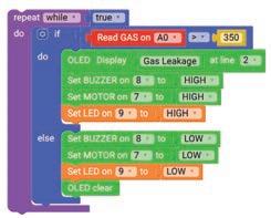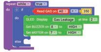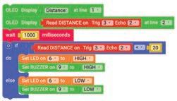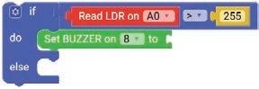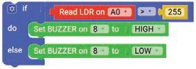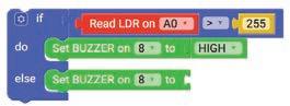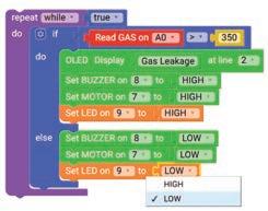 23. Drag the HIGH block from the OUTPUT category and attach it to the Set BUZZER on block. Select ‘LOW’ from the drop-down of the HIGH block