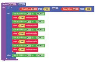 18. In this circuit, an IR sensor and a buzzer are connected to the brain module. When the IR sensor detects motion or an object, it sends a signal to the brain module, which then turns the buzzer on and off in a specific pattern to create a melody-like sound.