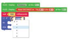 18. Drag the wait milliseconds block from the TIME category and drop it below the OLED Display block. Set the time to ‘100’ milliseconds (ms).