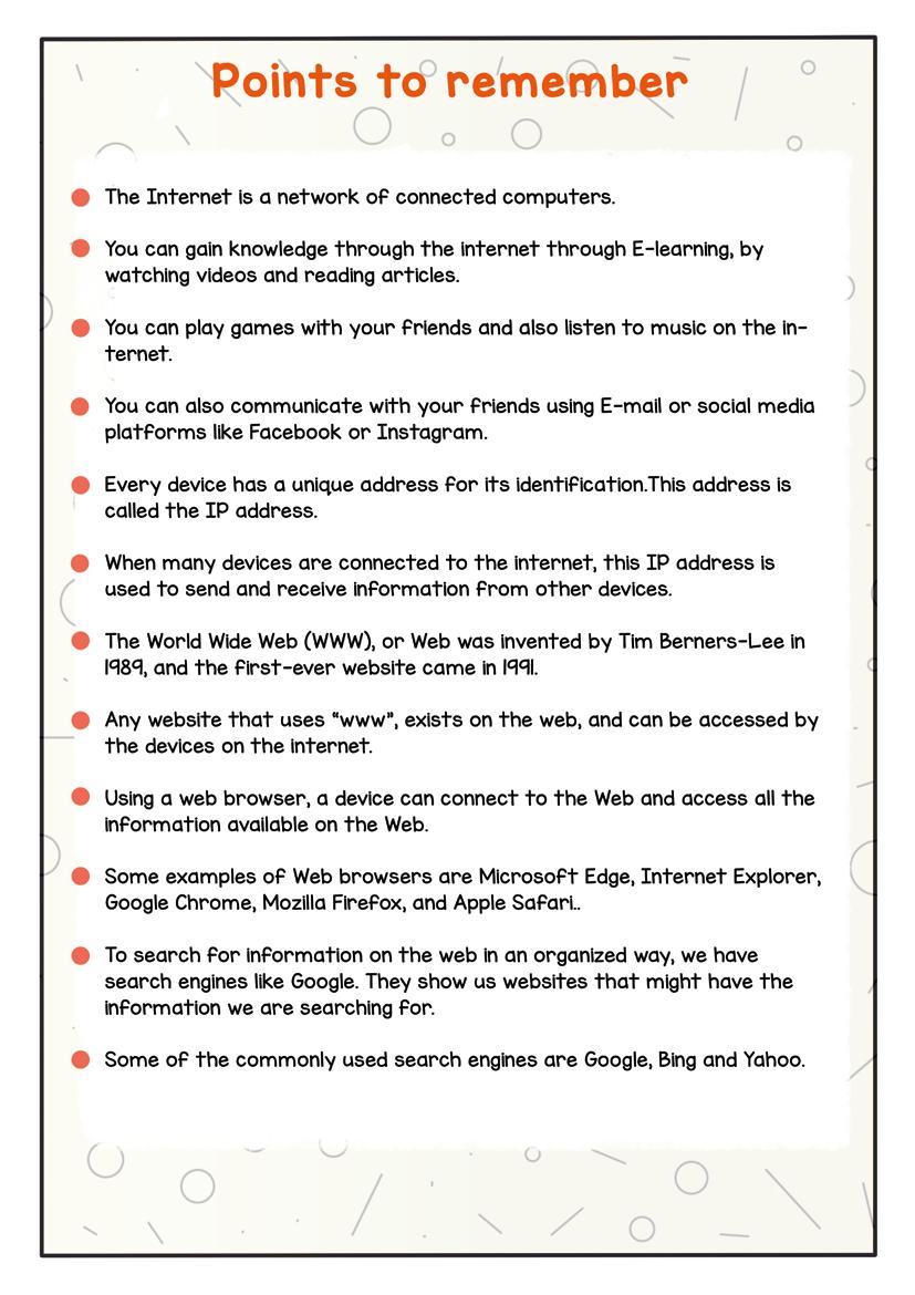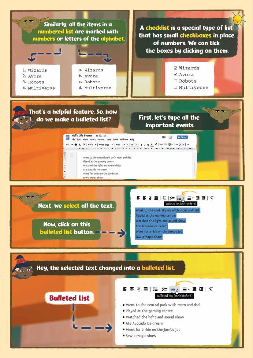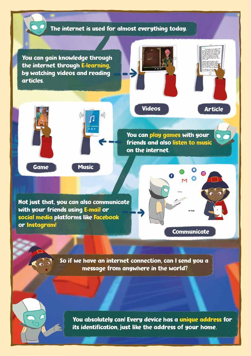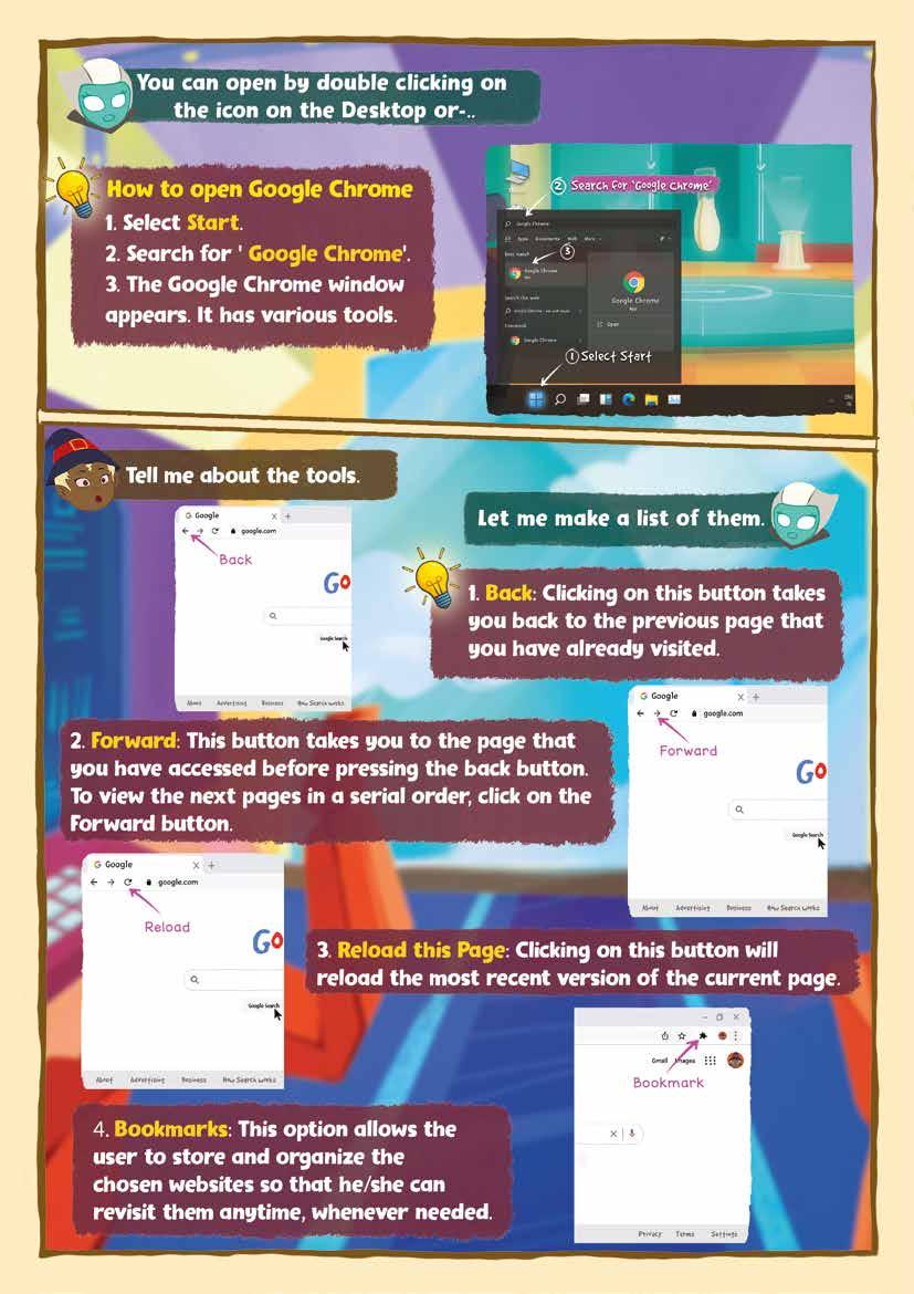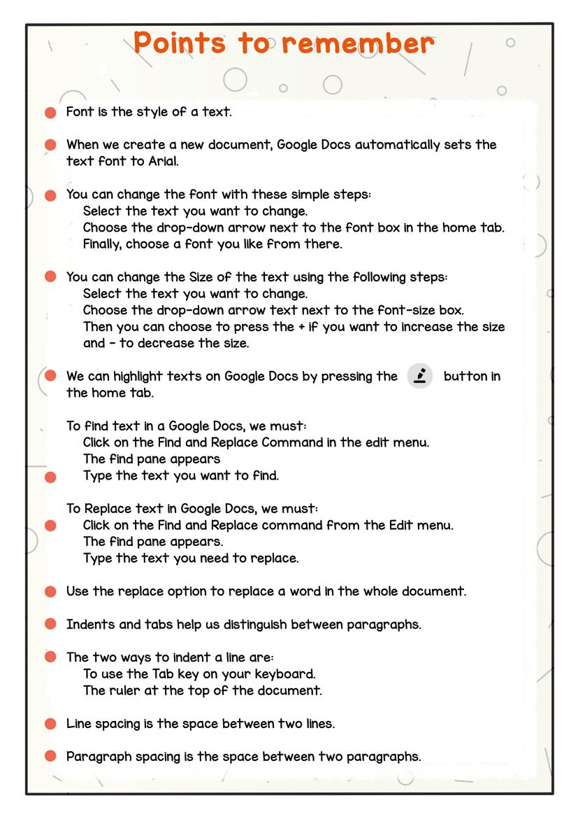 06 Chapter Google Slides - Introduction - Slides - Add, Edit & Organize - Themes - Tools Menu - Adding Text - Add Images - Edit Images - Resize Tool - Shapes 93 ACTIVITY & HOMEWORK 05 Chapter Google Docs Tools - Fonts - Font Style - Find & Replace - Indents, Tabs, & Line Spacing - Lists & their types - Hyper Link 59 ACTIVITY & HOMEWORK 01 Chapter Computer Memory and Storage - Computer memory and Binary - Bits, Bytes and memory size - RAM/ROM, Hard Disk - CD, DVD, Flash Drive, Memory Card 01 ACTIVITY & HOMEWORK 03 Chapter 04 Chapter - Files & folders - Cut, copy & paste files - Keyboard shortcuts - cut, copy & paste - Deleting files - Recycle bin & how to restore files Internet - Web Browser - What is Internet? - History and Uses of the Internet - WWW, Web Browser - How does the Internet work - Search engines Features of File Management 30 46 02 Chapter GUI Operating System - Desktop Management - Desktop, Taskbar & its uses - Search bar & Cortana - Setting Date & Time - Quick launch - Shortcut icons & creating desktop shortcuts 13 ACTIVITY & HOMEWORK ACTIVITY & HOMEWORK ACTIVITY & HOMEWORK