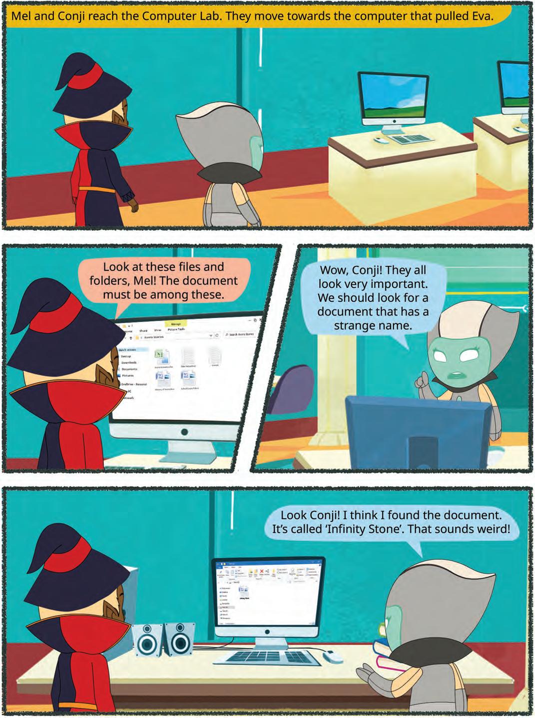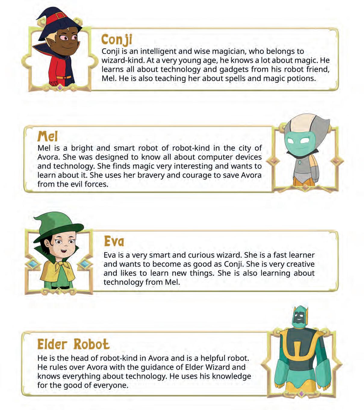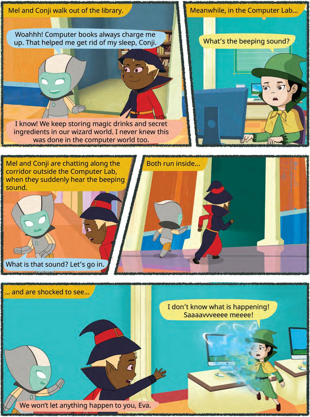 In every grade, students embark on an immersive experience in the “Adventures of Mel and Conji.” Within each chapter, in the initial section (Section A), the story unfolds, enveloping learners in an exciting journey. Through the story, students actively connect with fundamental concepts in the realm of Computer Science.