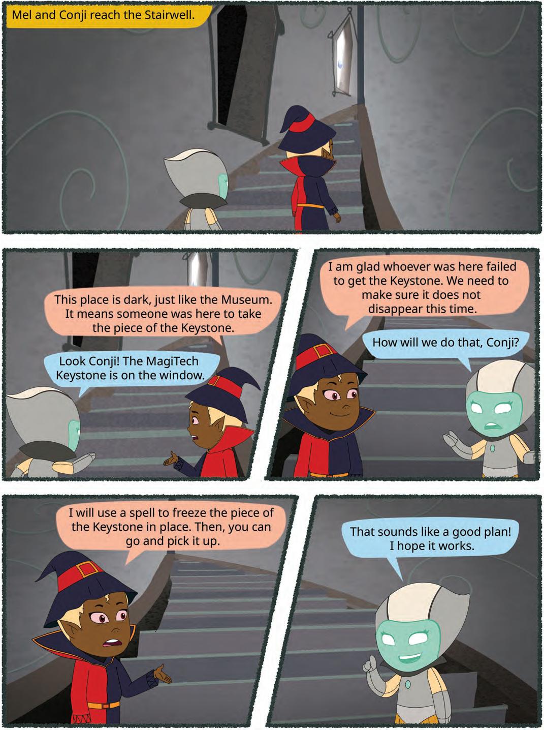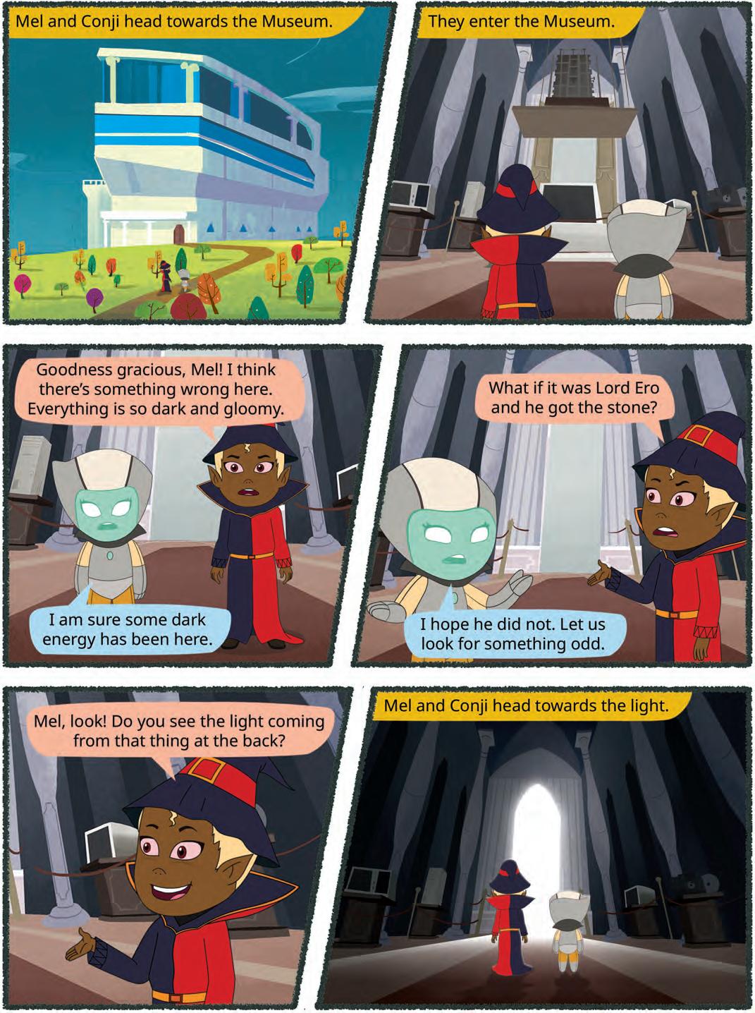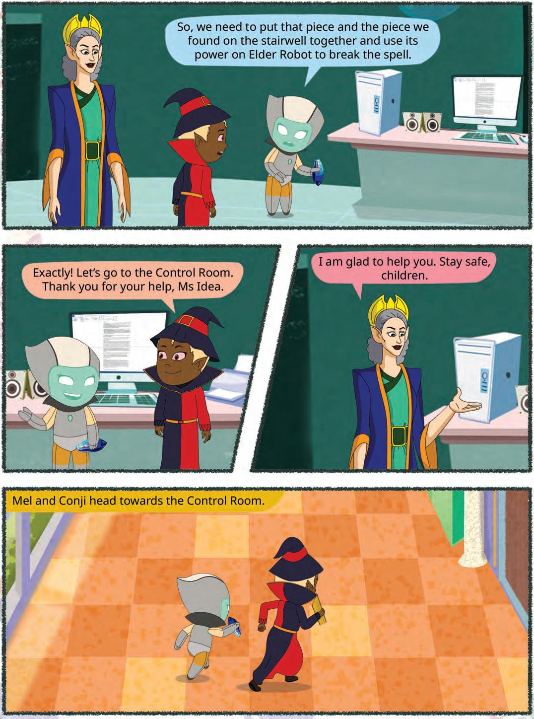 In every grade, students embark on an immersive experience in the “Adventures of Mel and Conji.” Within each chapter, in the initial section (Section A), the story unfolds, enveloping learners in an exciting journey. Through the story, students actively connect with fundamental concepts in the realm of Computer Science.
