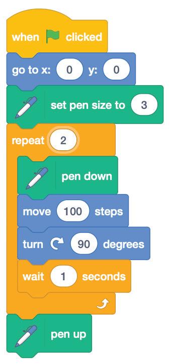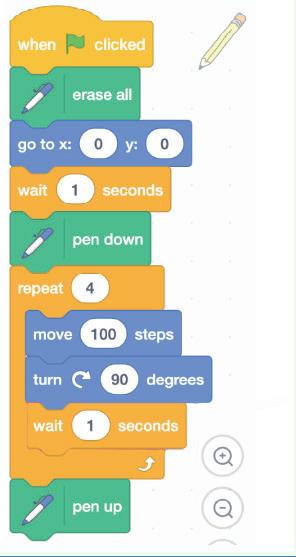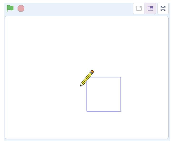 1 A square is a 2D shape with four sides and four corners. All sides of a square are of the same length. Draw a square using a pencil sprite and the given script.