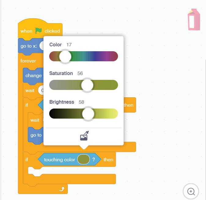 2 Drag the touching color? block from the Sensing category to the blank section of the if… then block.