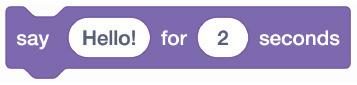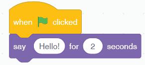 4 Drag the say Hello! for 2 seconds block from the Looks category and join it to the touching color? block.