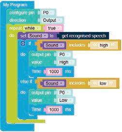 • When the voice recognition model detects the word “high”, the LEDs on the Maker Board light up at a high intensity.