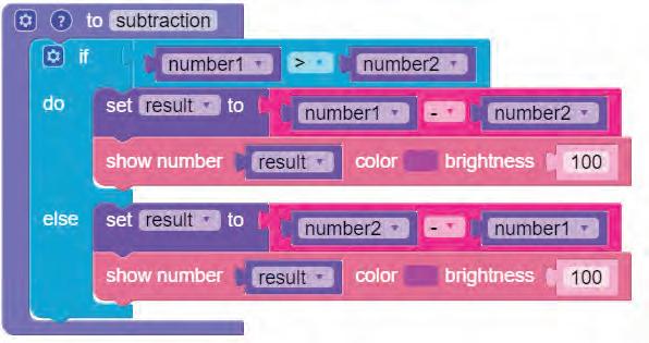 25. Create a function named "subtraction" and set the value of the result to subtraction of number1 and number2 based on which number is greater. Show the result on the matrix using the if and else blocks. If the conditional statement of the if block is false, then the statement(s) of the else block will be executed.