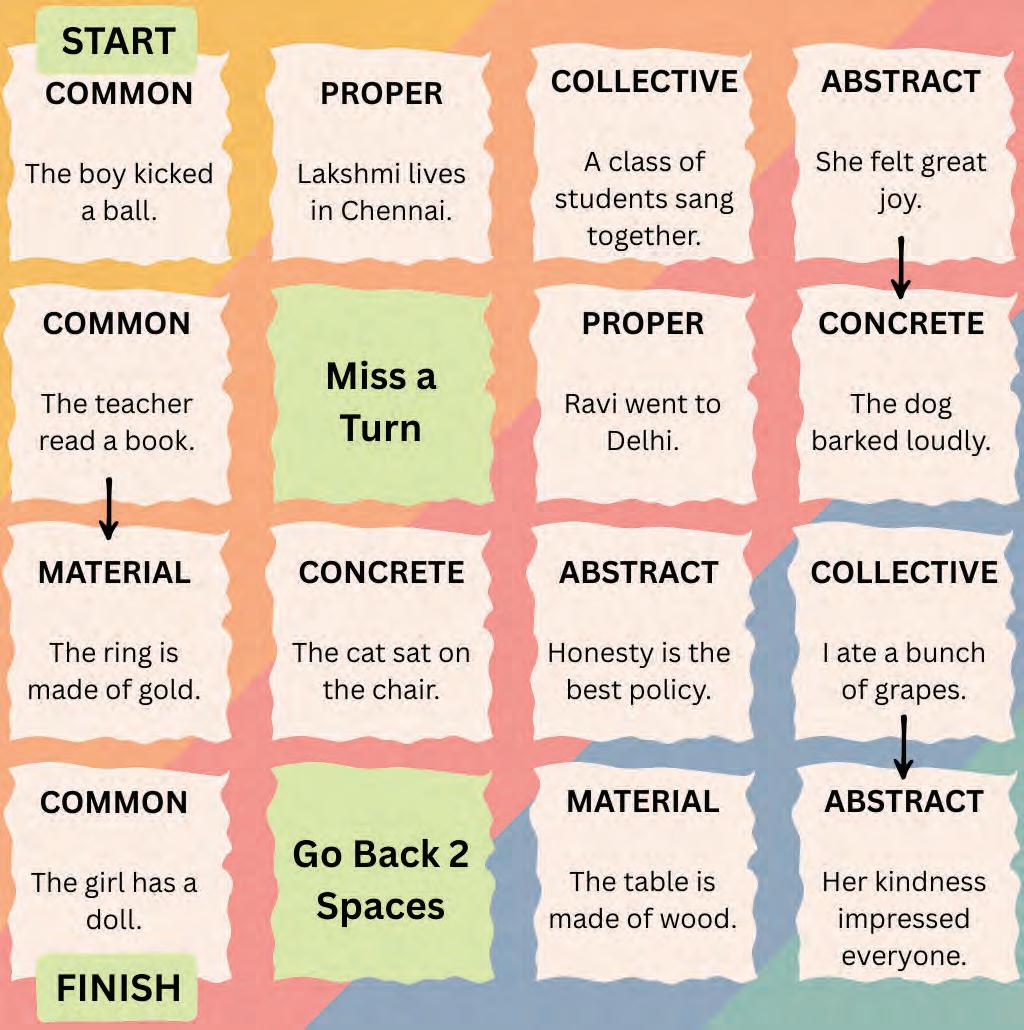 • use common, proper, collective, abstract, concrete and material nouns in different contexts.