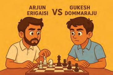 esterday,Y I watched an exciting chess match between Arjun Erigaisi and Gukesh Dommaraju. It was amazing! The players were very focussed, and they moved their pieces carefully. Arjun shouted, ‘Checkmate!’ and everyone cheered. Did you know that Arjun is only 20 years old? The commentator said that he is very talented. Wow! What a match.