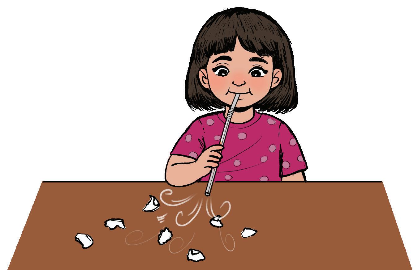 3. Use the straw to blow air on the paper pieces. Watch them move.