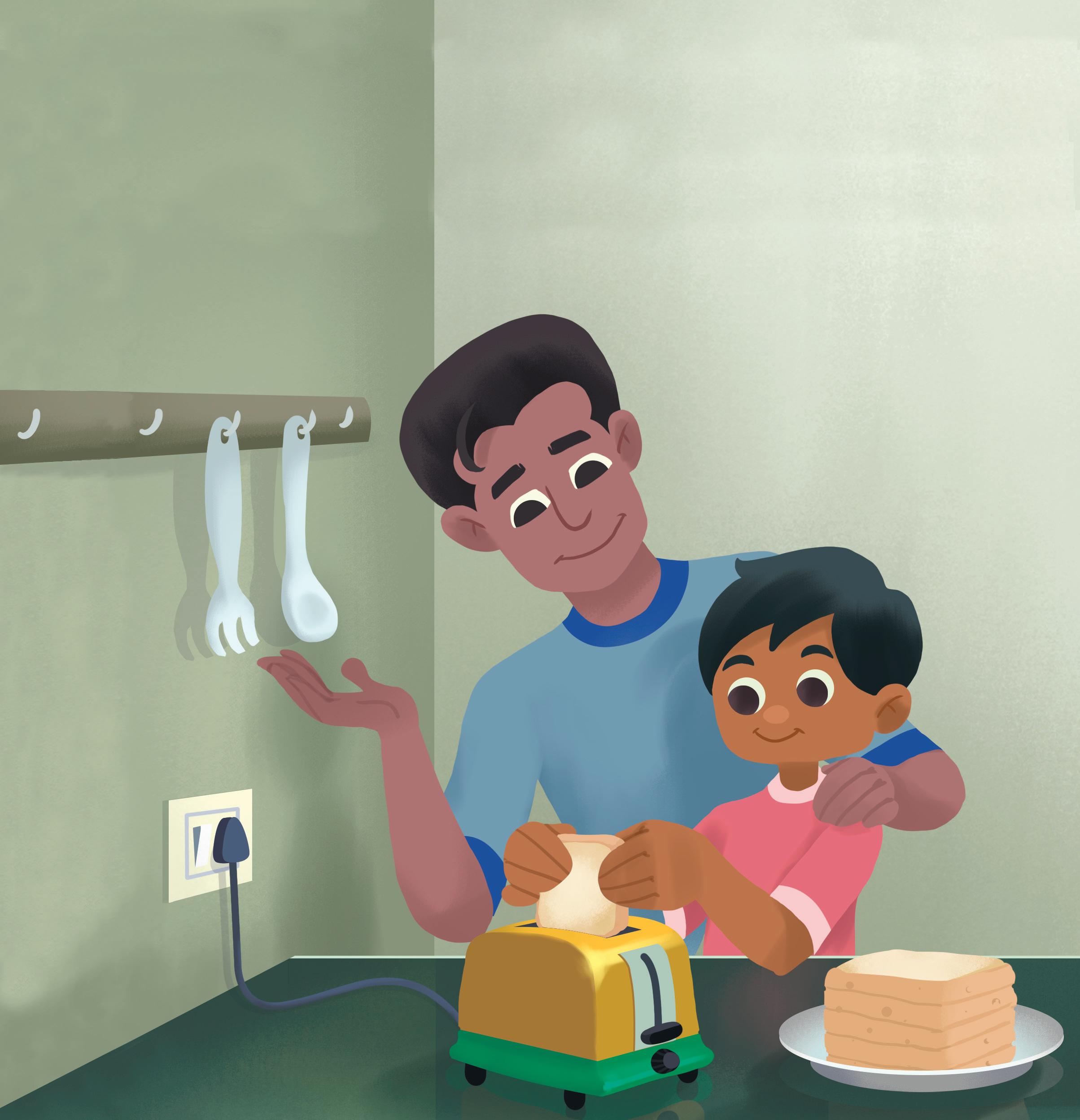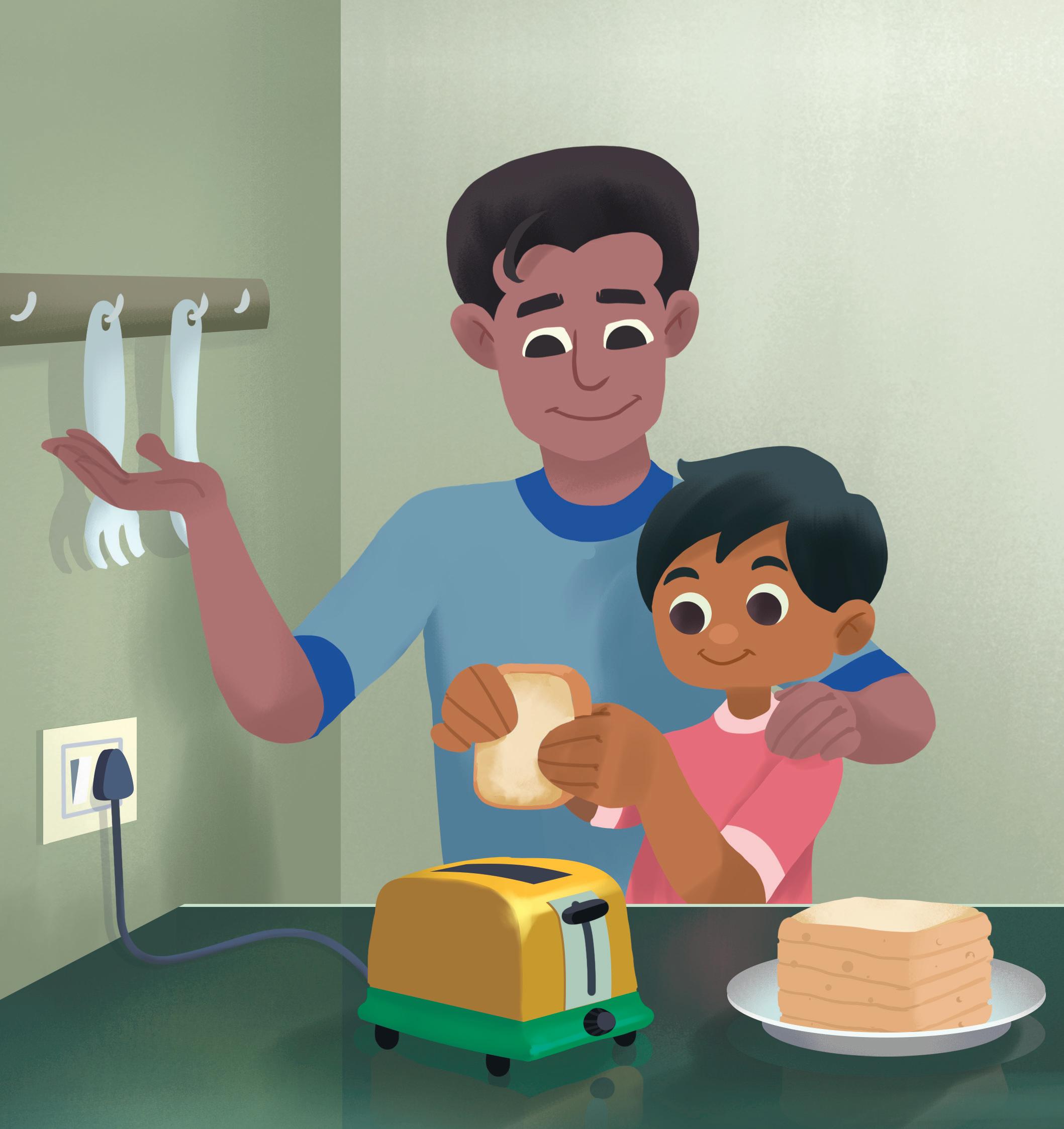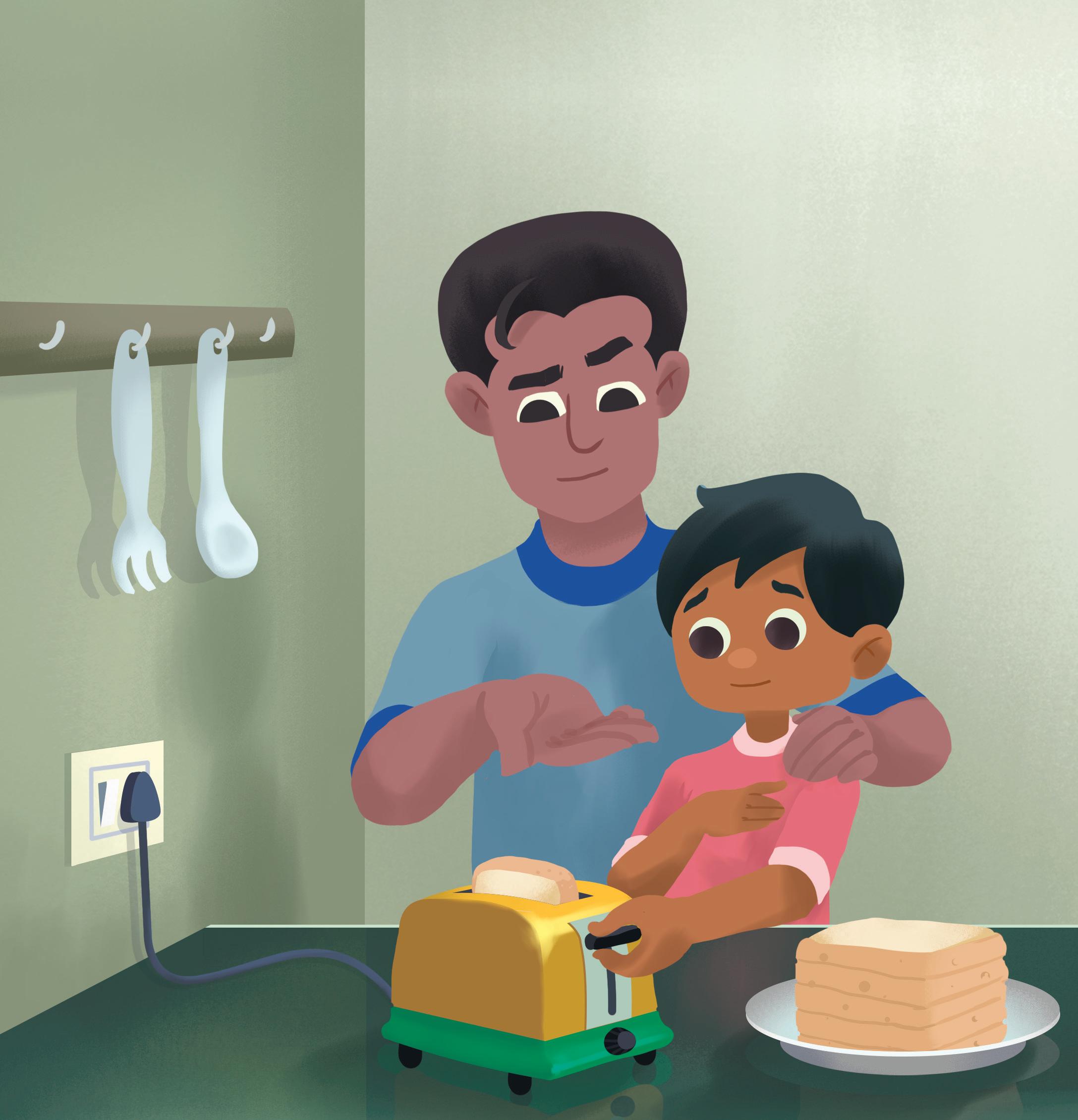 Dad and I are making breakfast. We put bread in the toaster.