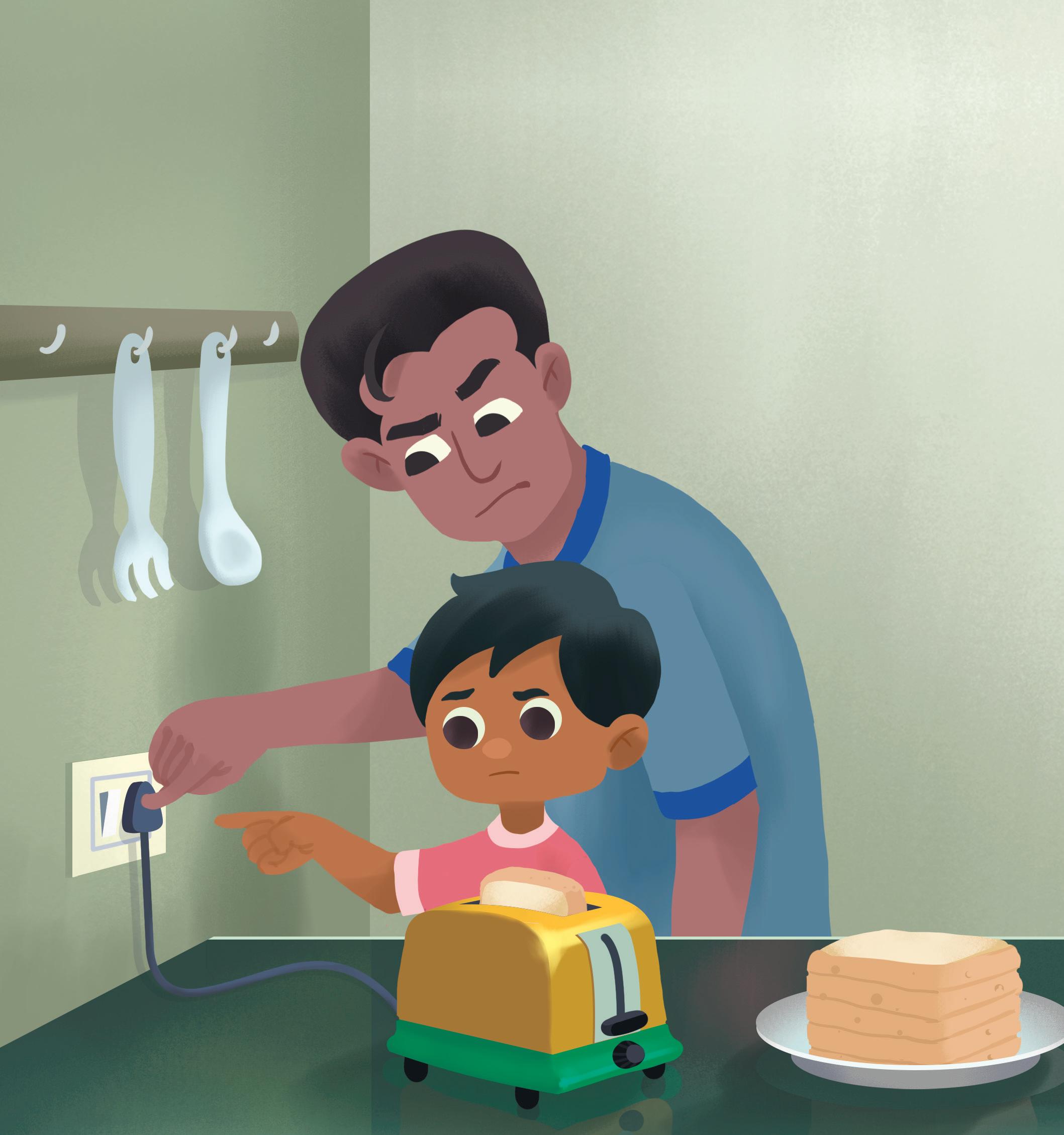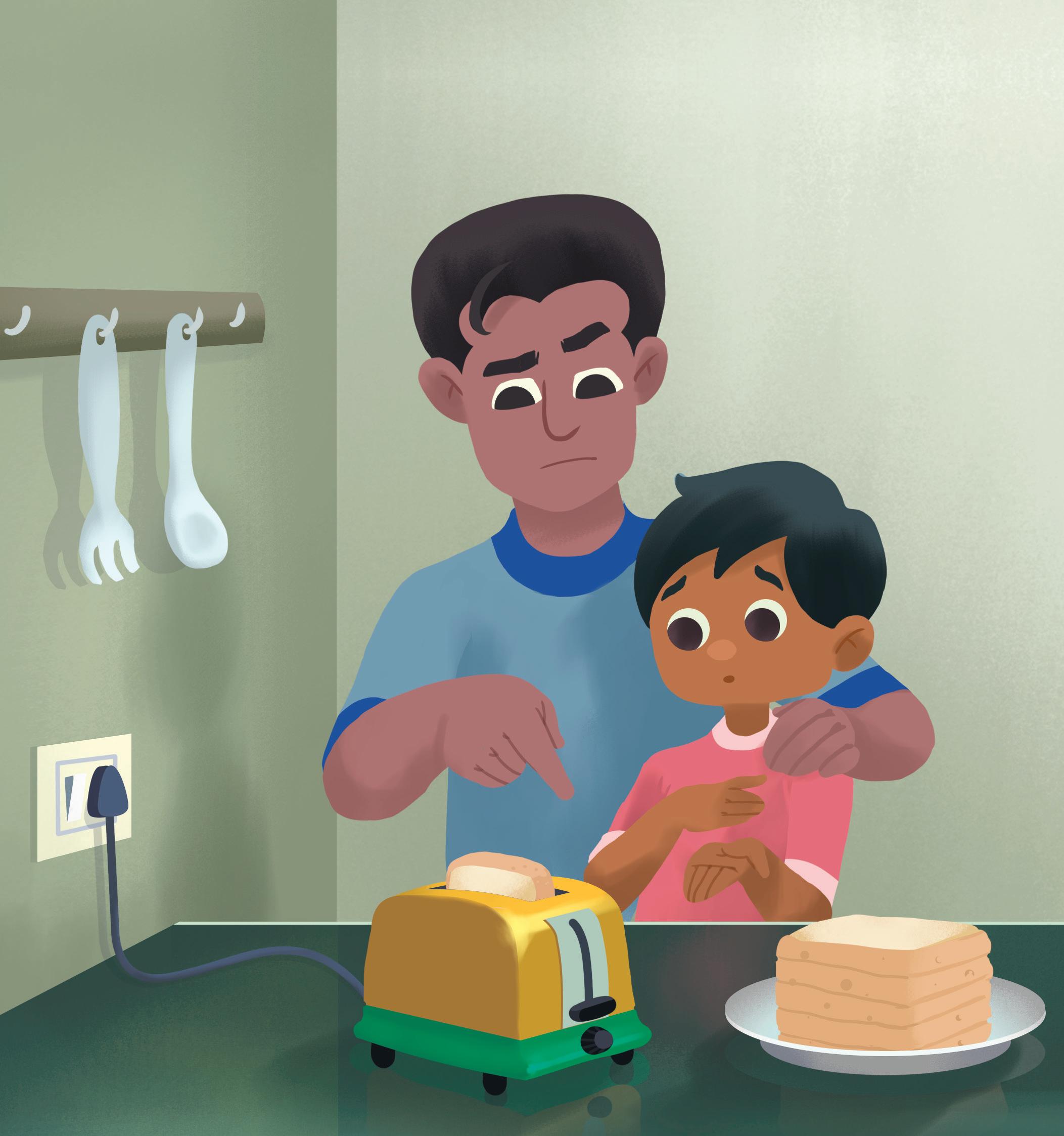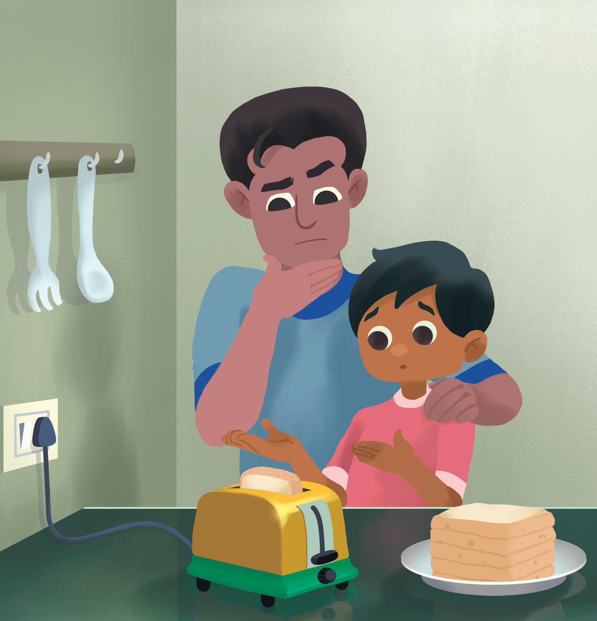 Dad and I are making breakfast. We put bread in the toaster.