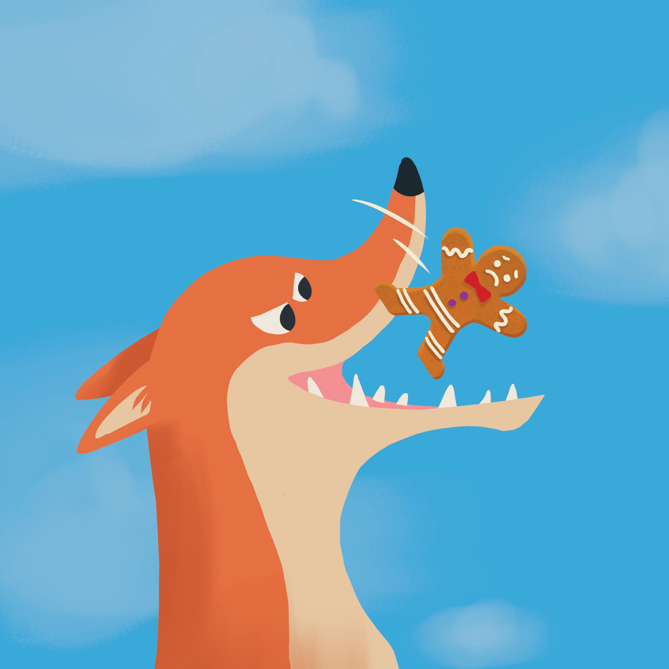 The gingerbread man jumped high. SNAP went the fox’s mouth. And that was the end of the gingerbread man!