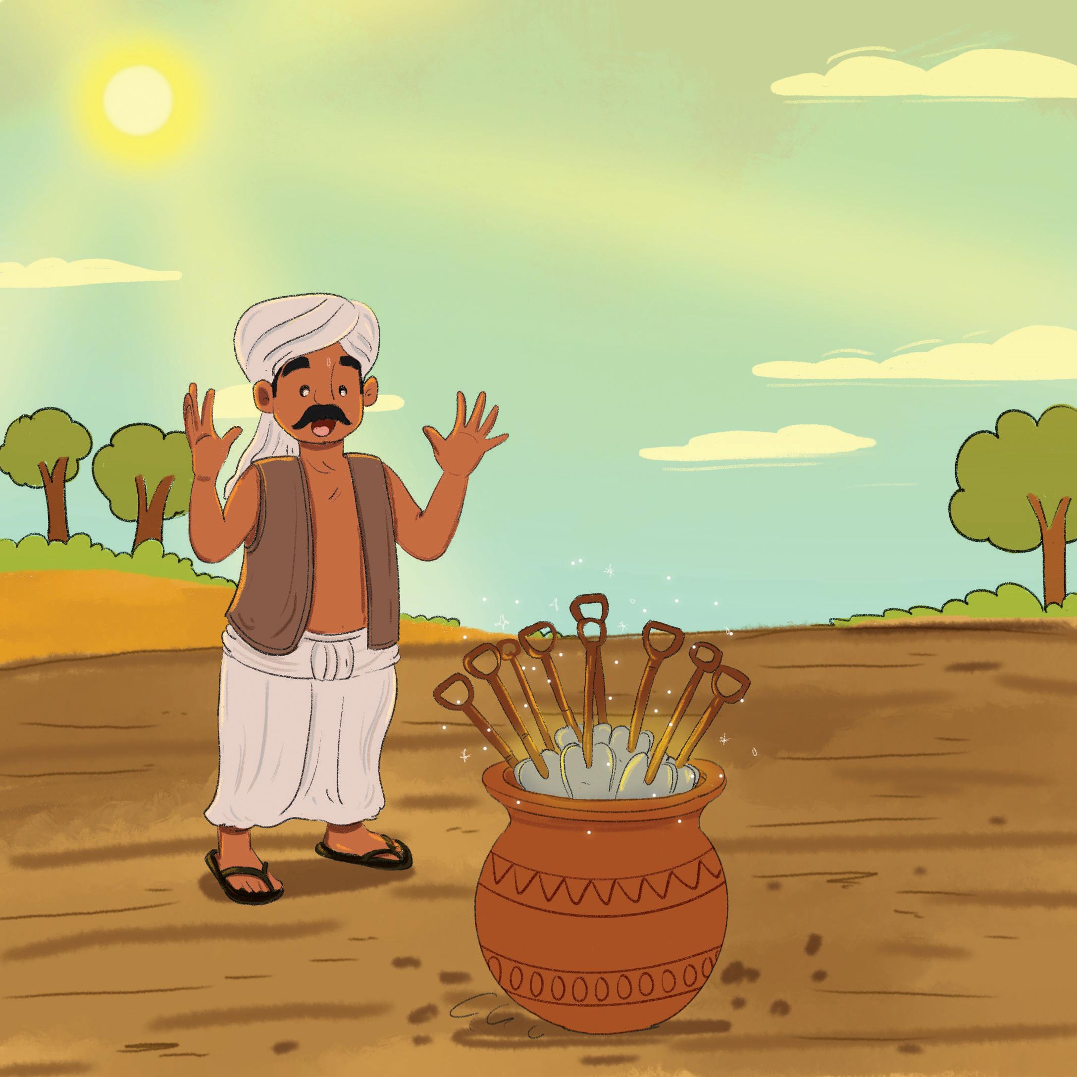 On a hot afternoon, Gopi the farmer was ploughing the field. While digging, he suddenly heard a CLANG! Gopi found a big metal pot.