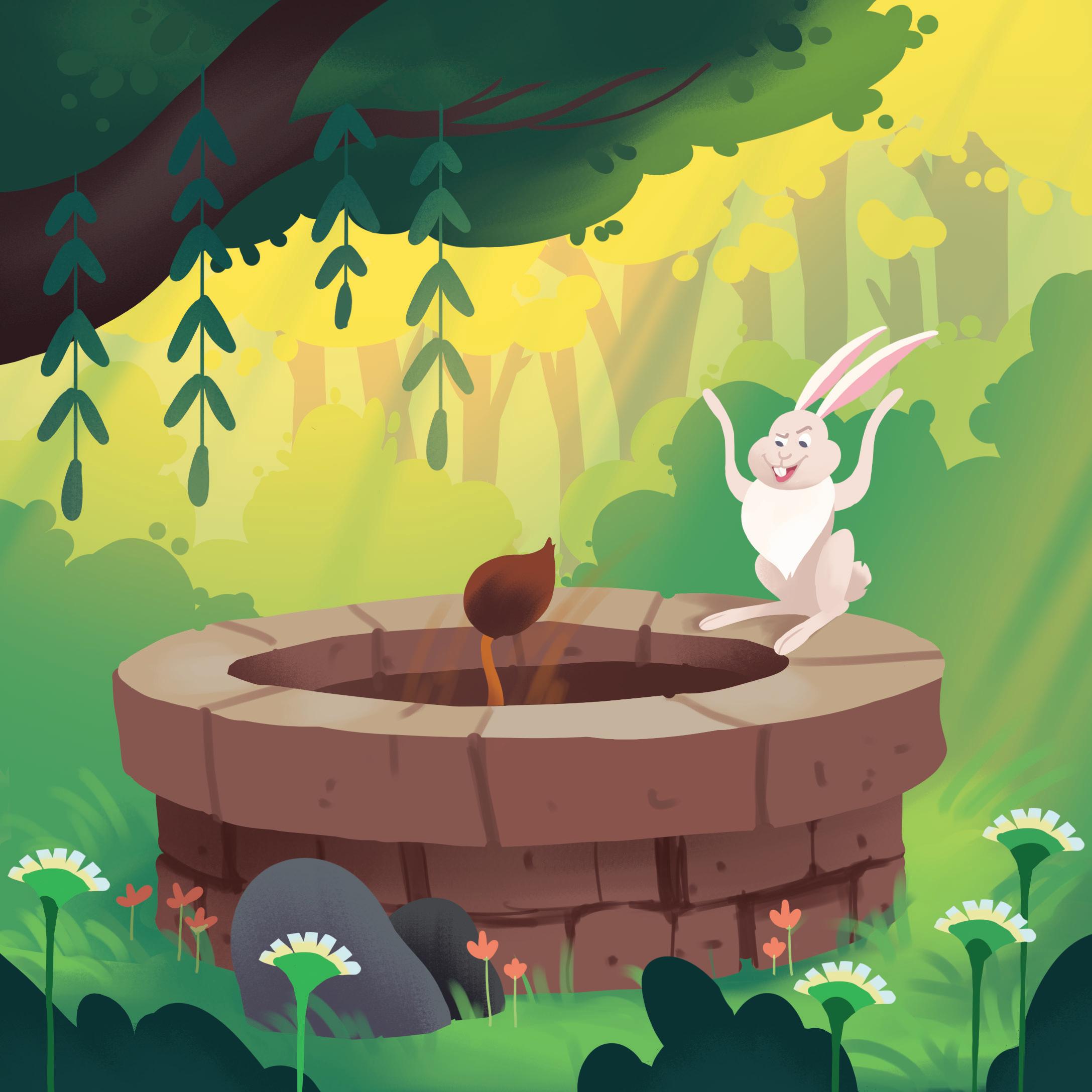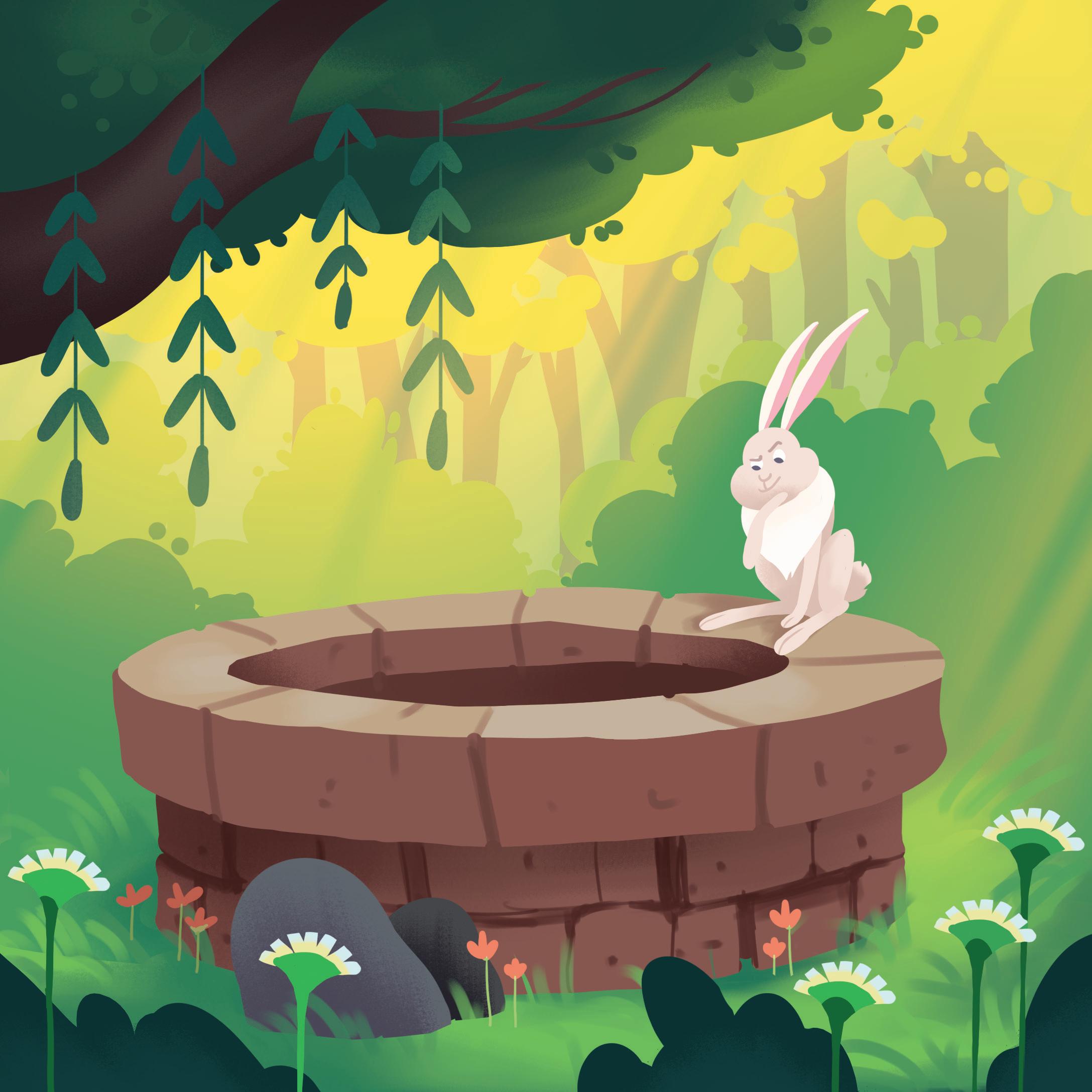 The clever hare went to the well. He thought of a plan.
