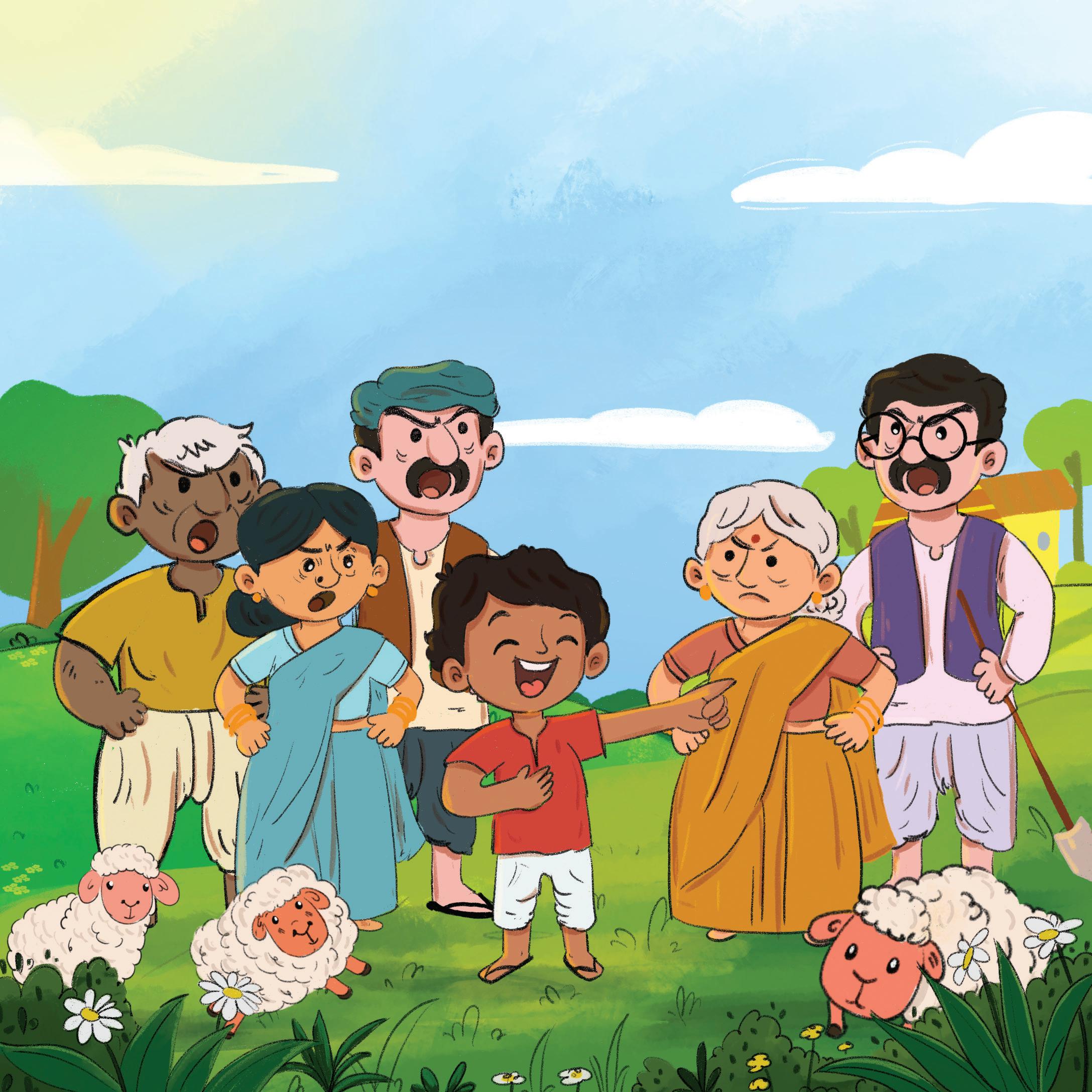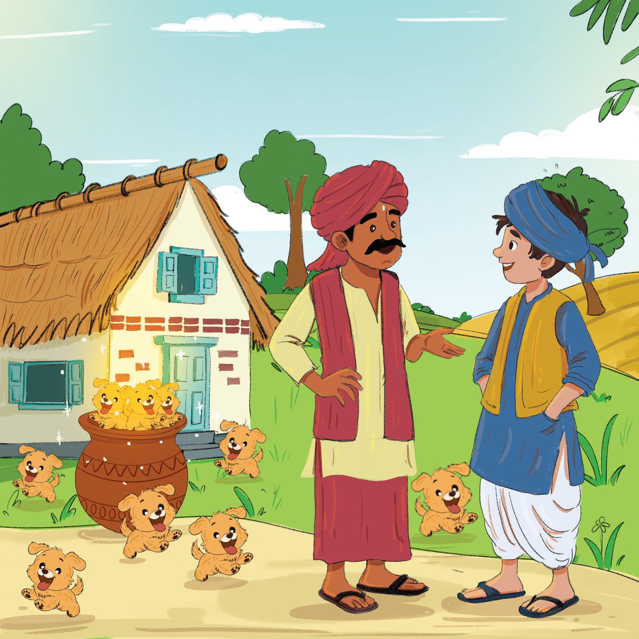 The neighbour ran away in fright! All the dogs ran after him, barking loudly. The neighbour never came to Gopi’s house again. Gopi kept on helping the villagers.