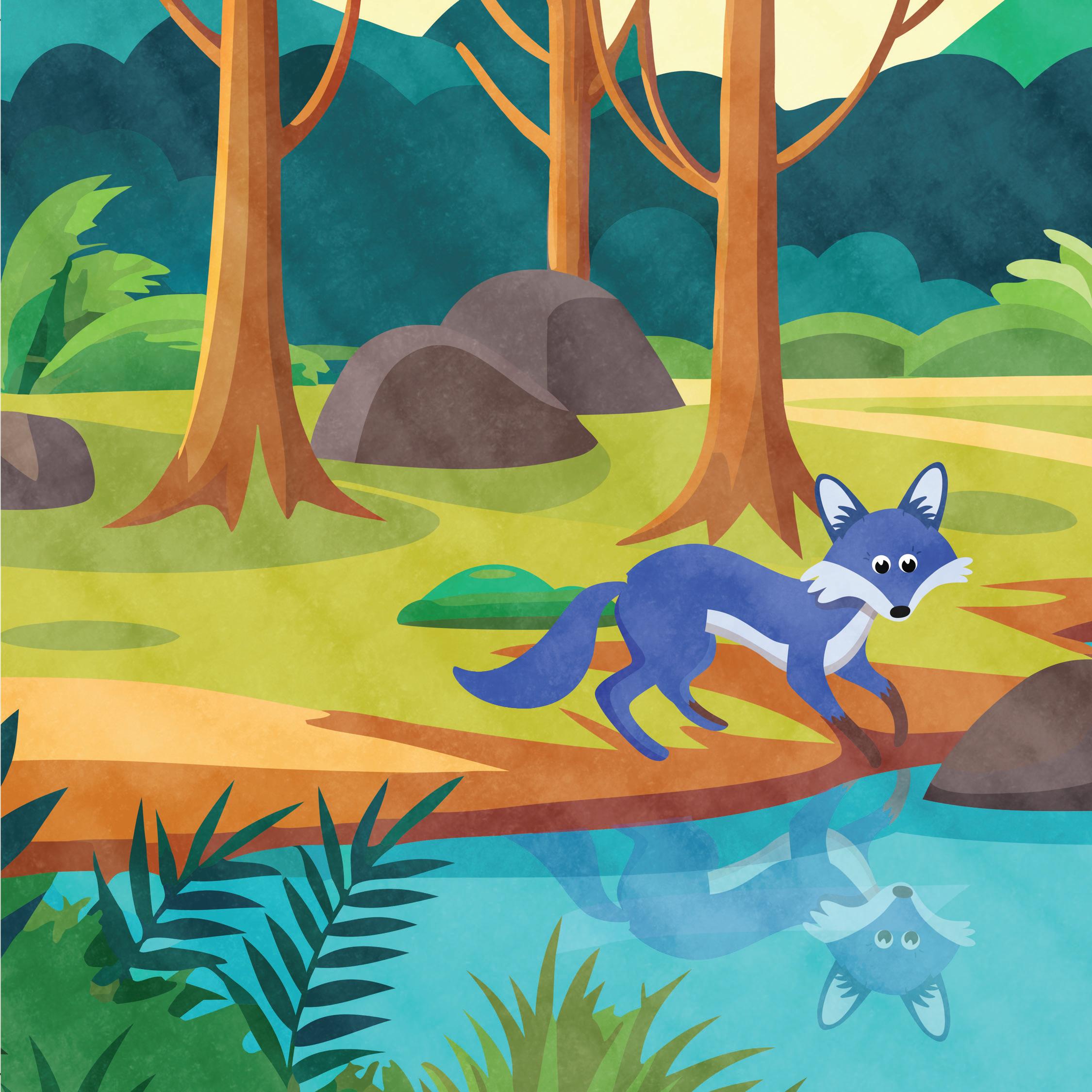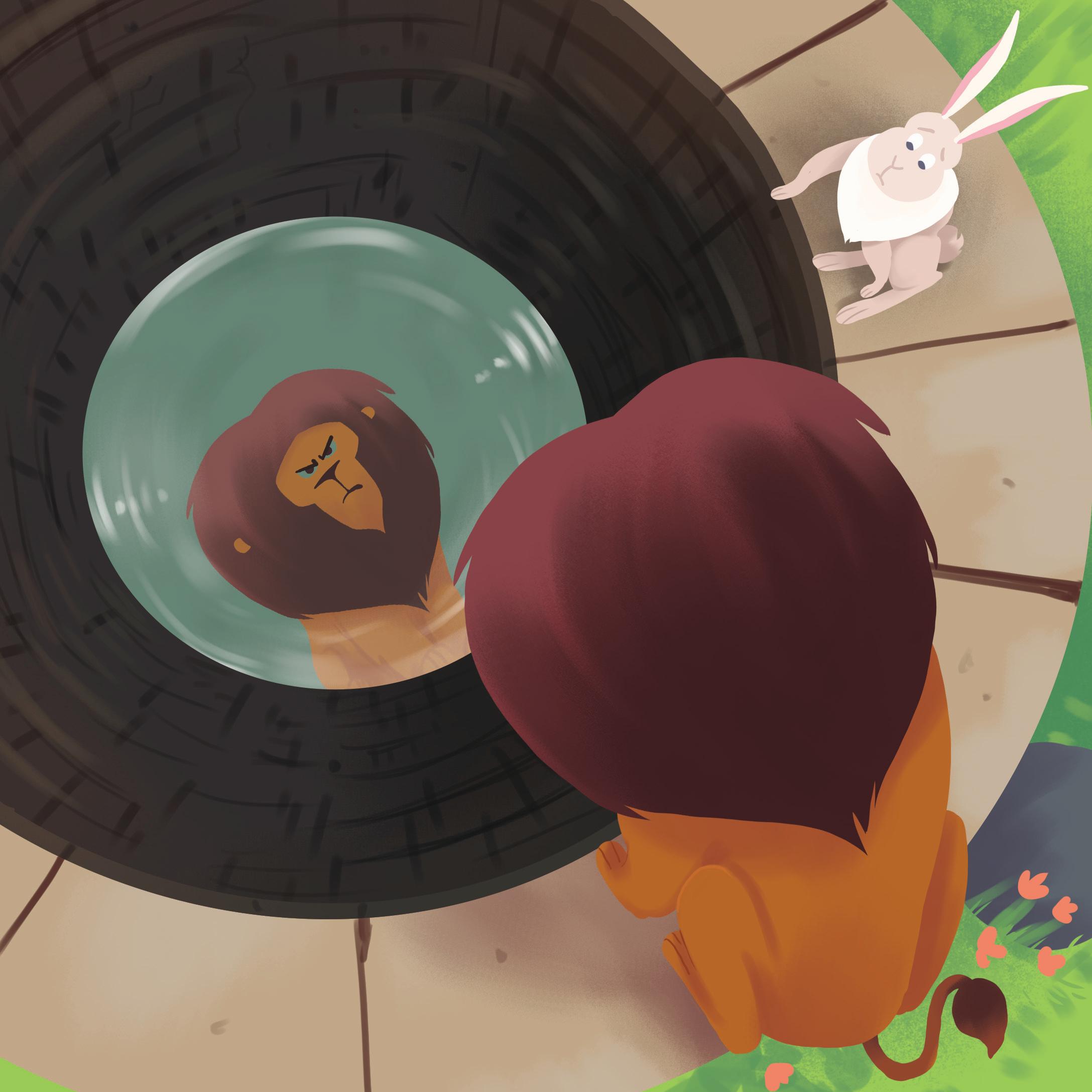 The lion saw his reflection in the well. He thought it was another lion. He jumped to attack it and fell into the well!