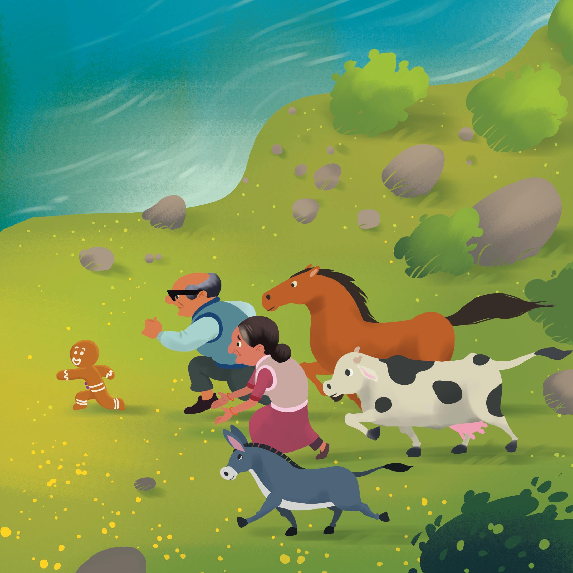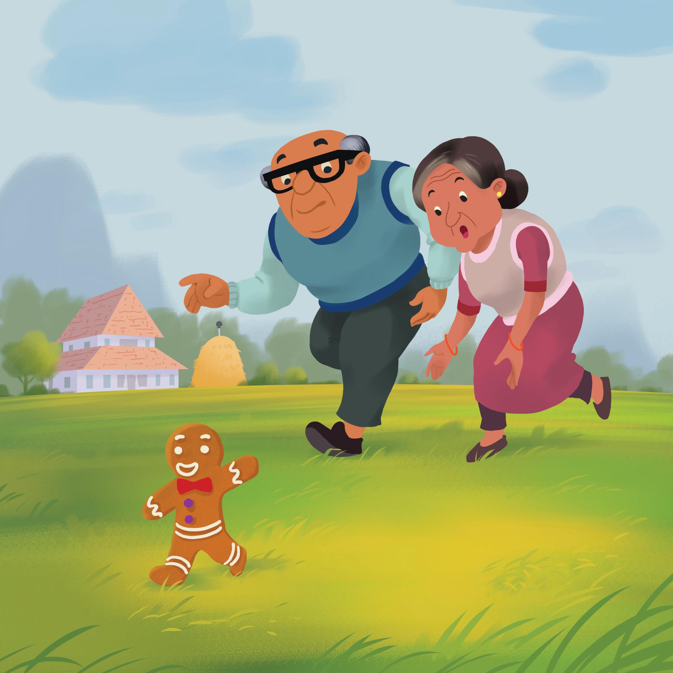 The gingerbread man then ran outside. The old woman and the old man chased him. The gingerbread man just ran faster and faster. Come back! Come back!