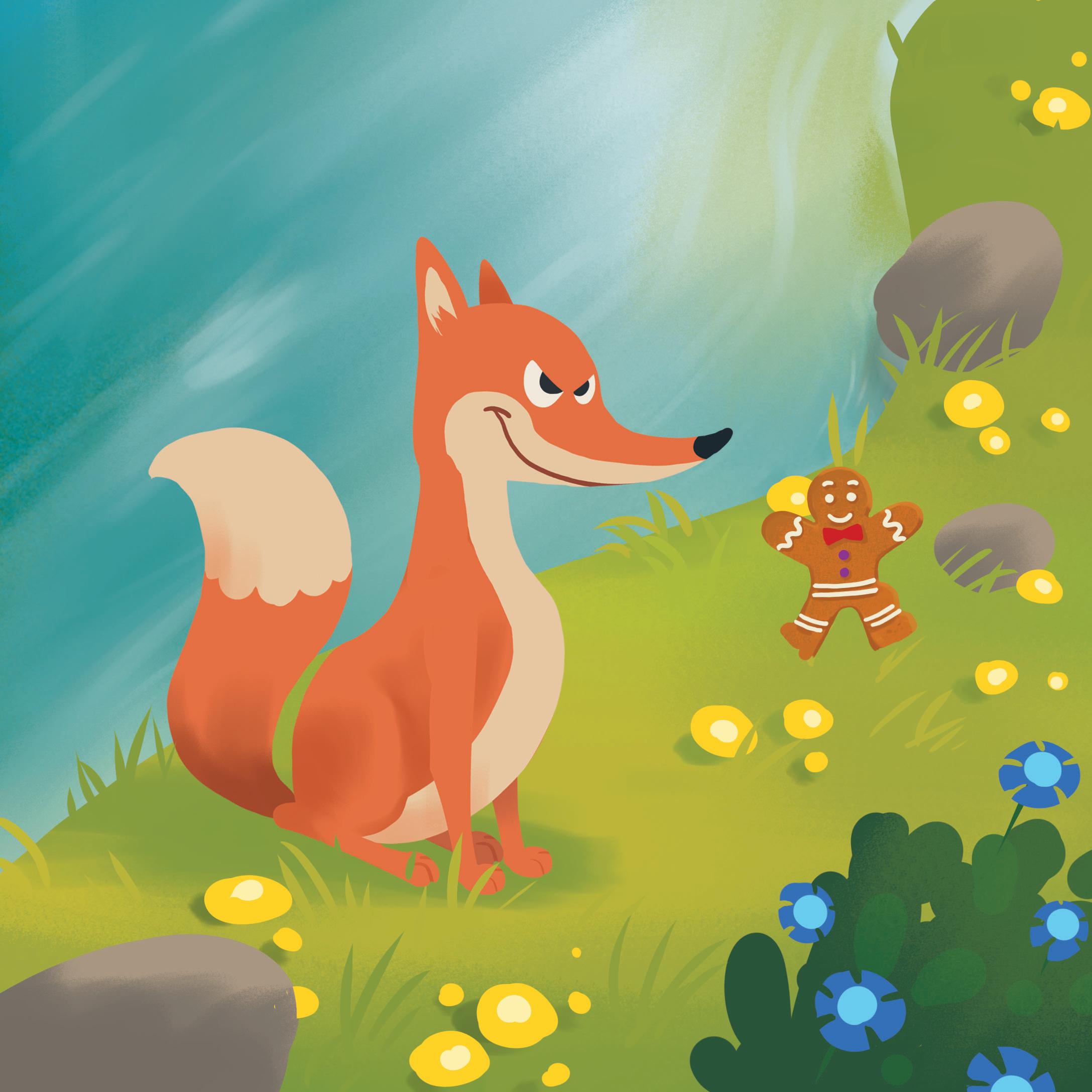 A clever fox was standing at the river. He saw the gingerbread man. He knew how to catch him.