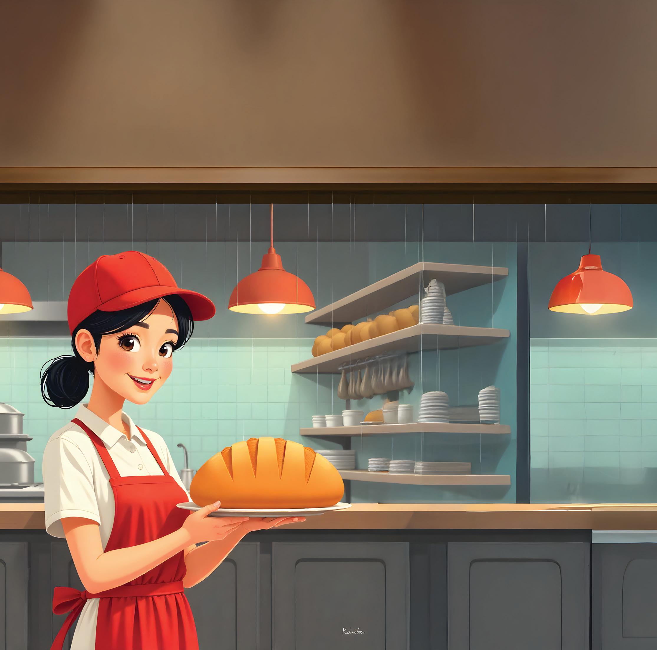 Here is the baker, I smell the bread, She wears a red cap on her head.