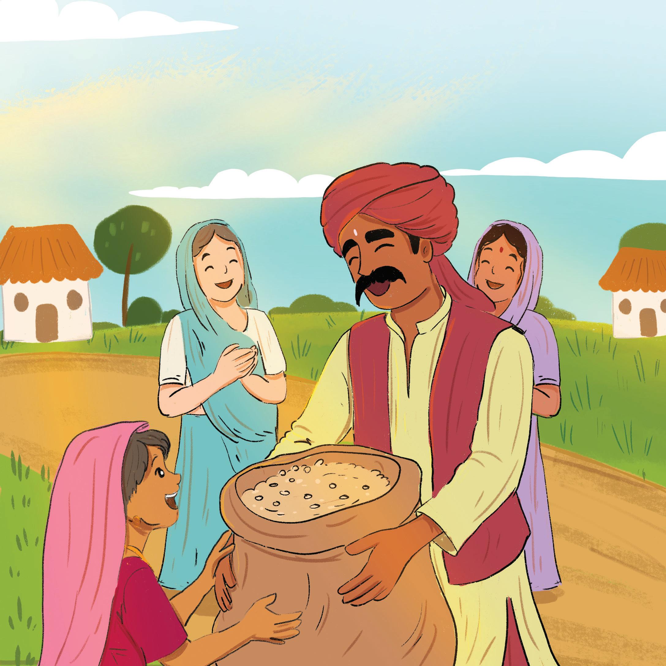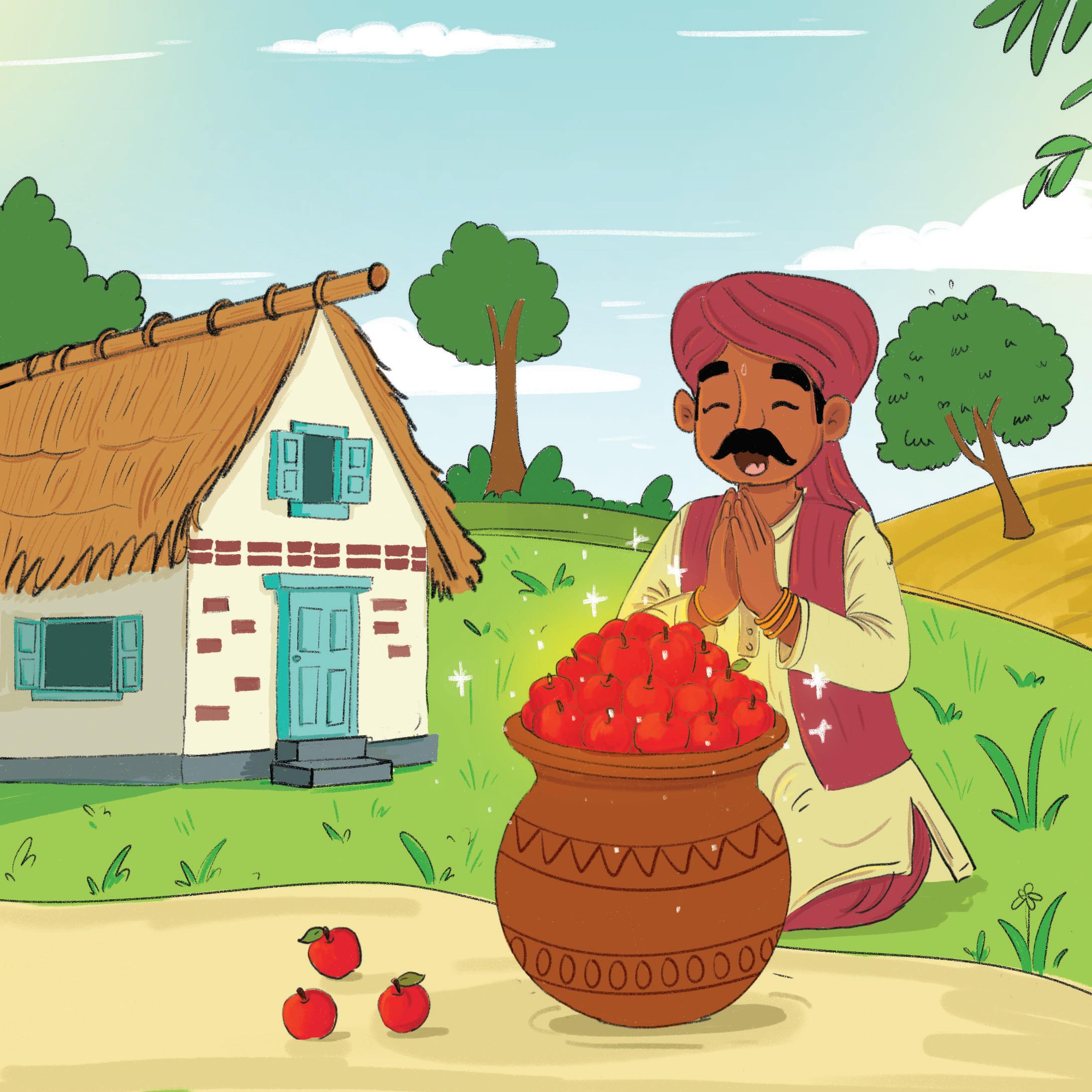 He then put an apple in the pot and found lots of apples! Gopi shared the spades and the apples with the villagers. Gopi kept the pot a secret. He became rich and helped the people in his village.