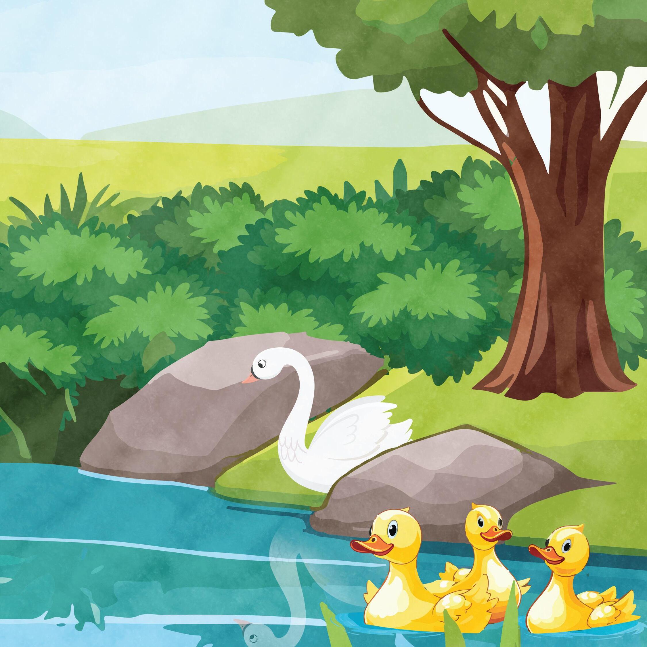 The duckling grew and grew. Now he was much bigger than other ducklings in the pond. He was white and had a long neck. He looked at himself in the pond and said, “Now I am even uglier!”