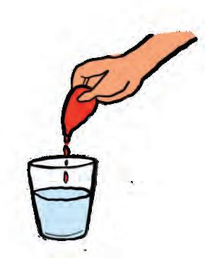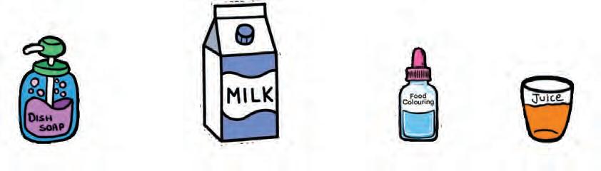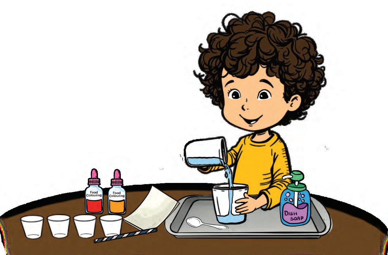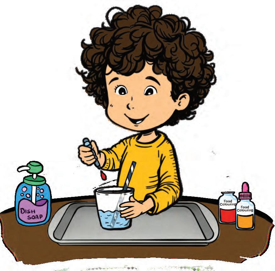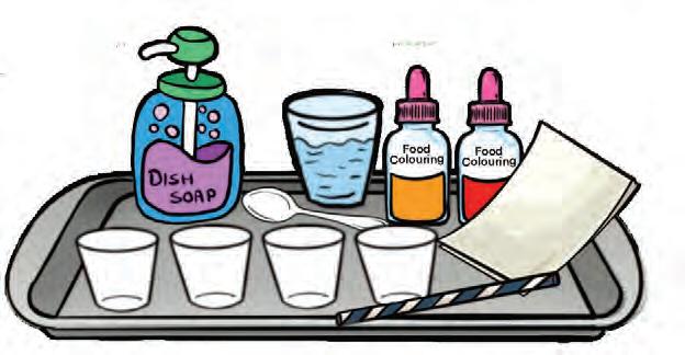 2. Add 1 teaspoon of dish soap and 2–3 drops of food colouring. Stir it gently with a straw.