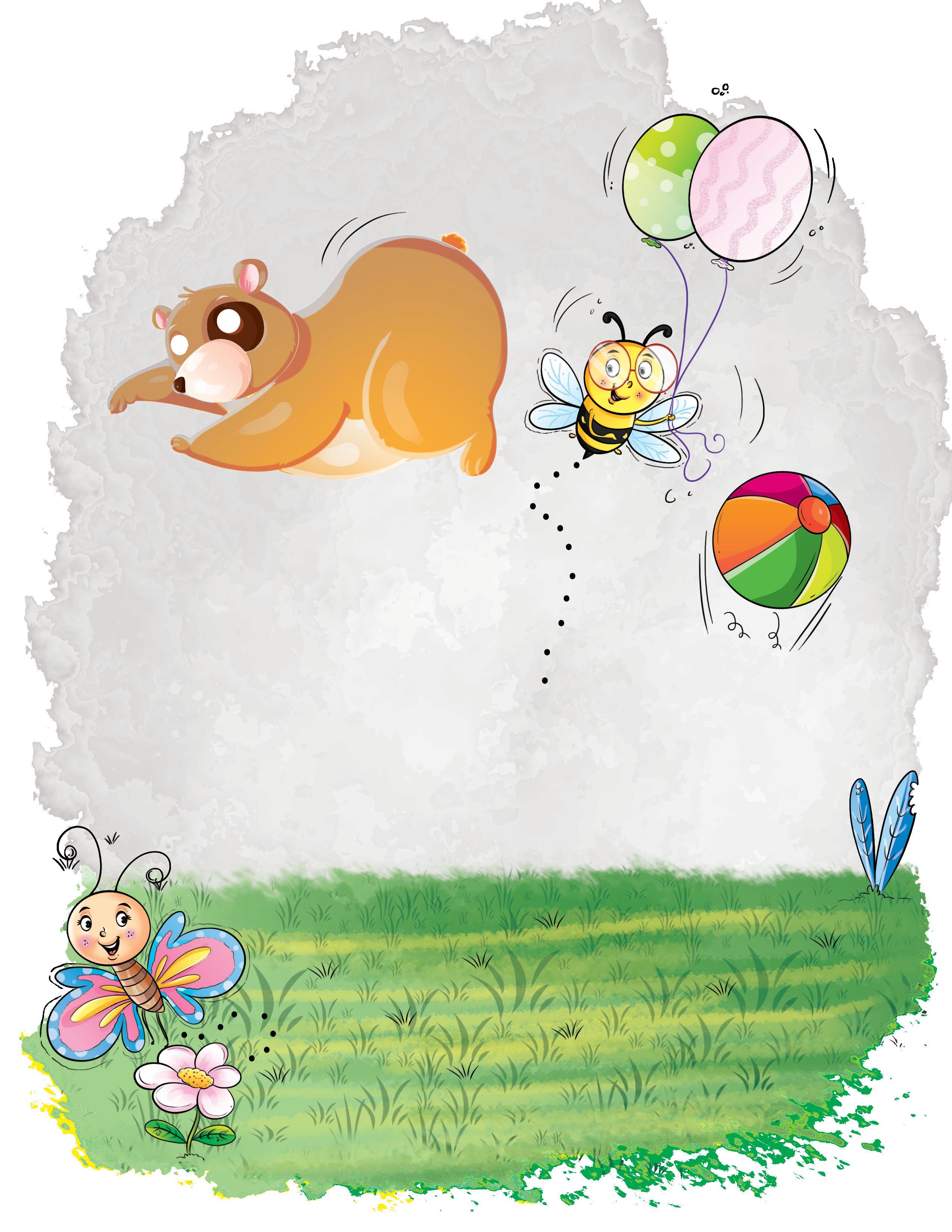 bThe bouncing ball goes up and down, A brown bear dances on the ground.