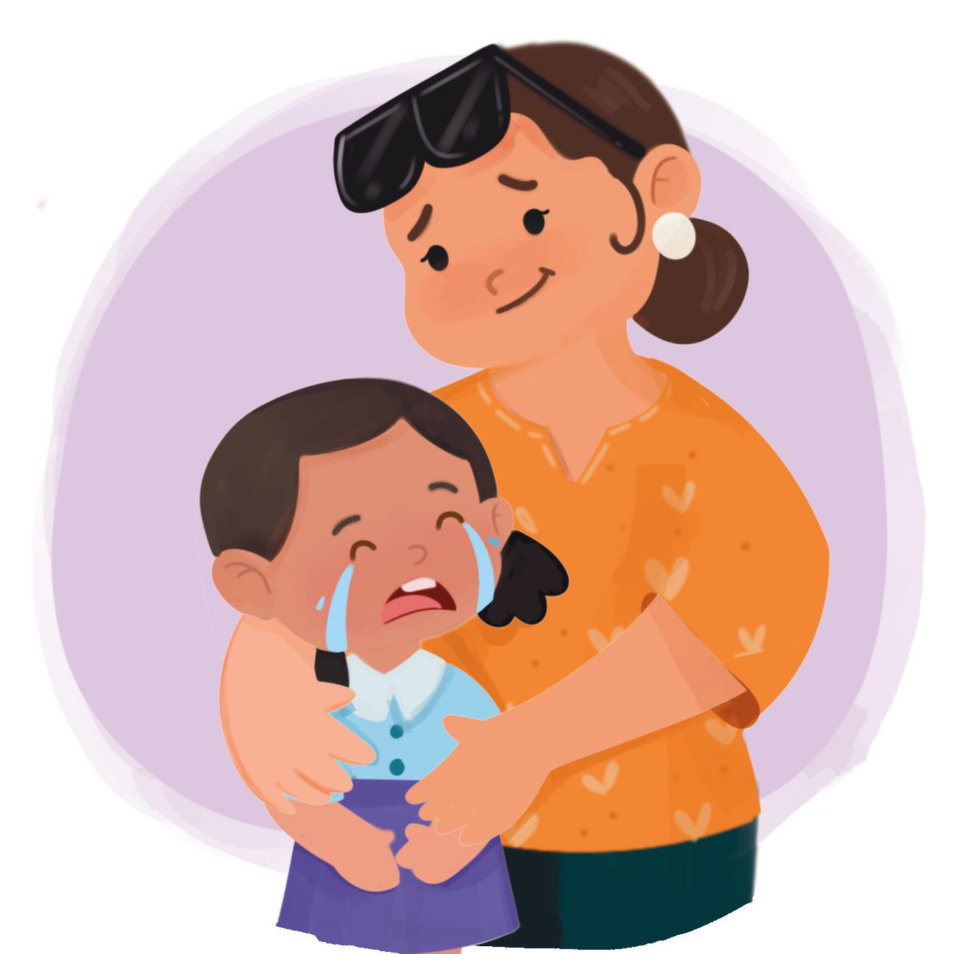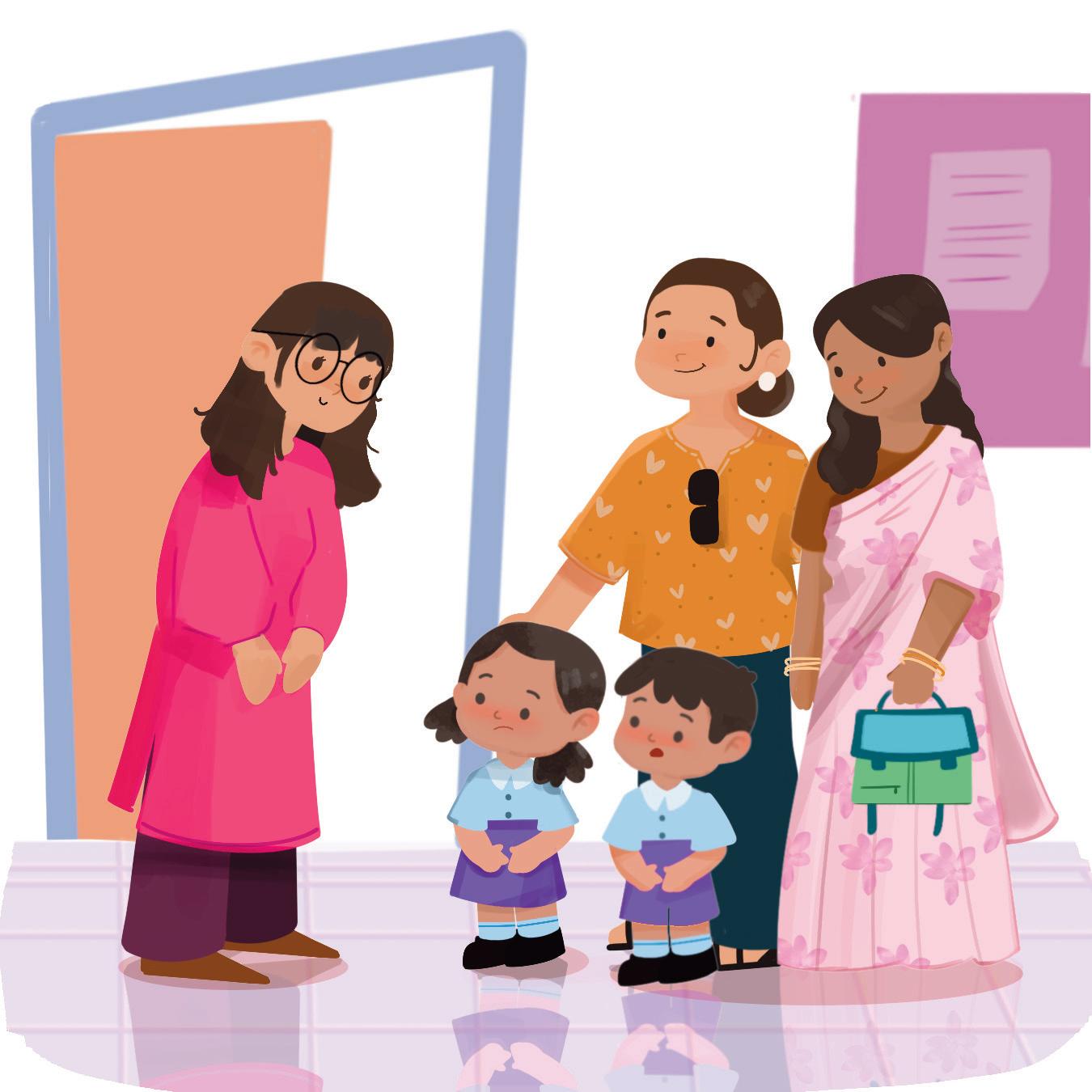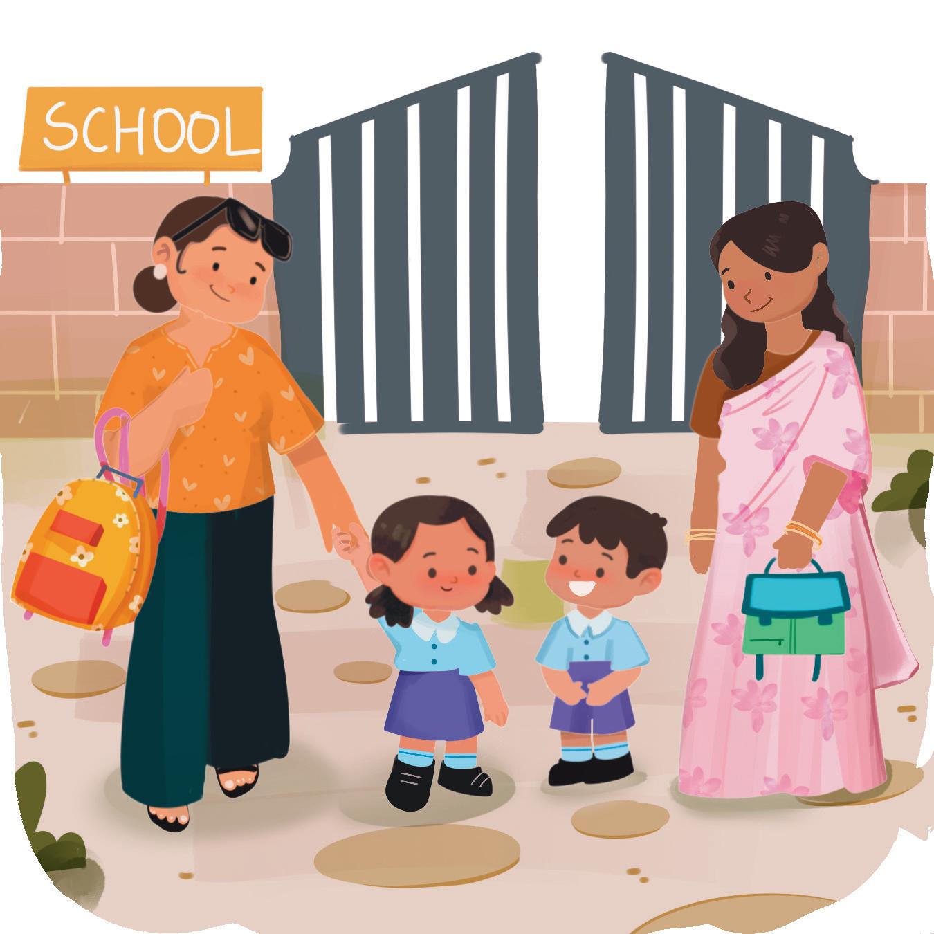 Mira and Raja say bye to their mothers and run inside the classroom.