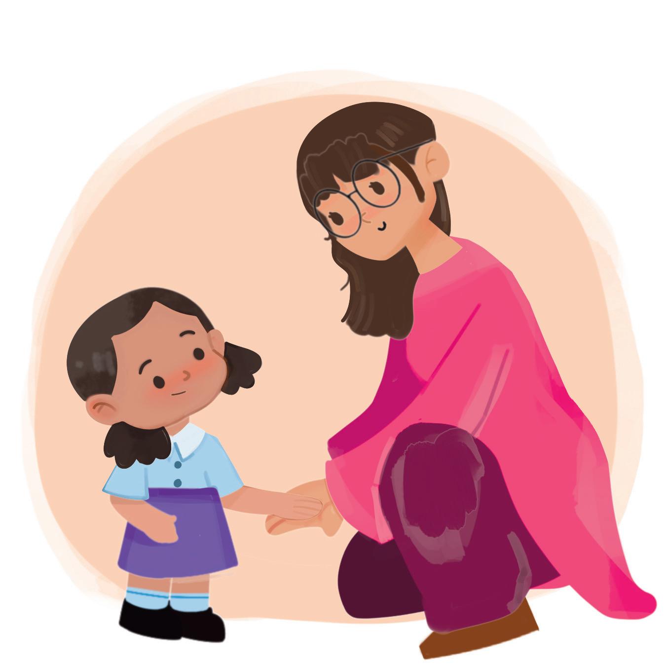 Miss Nina takes Mira to the classroom. Mira sees happy children.