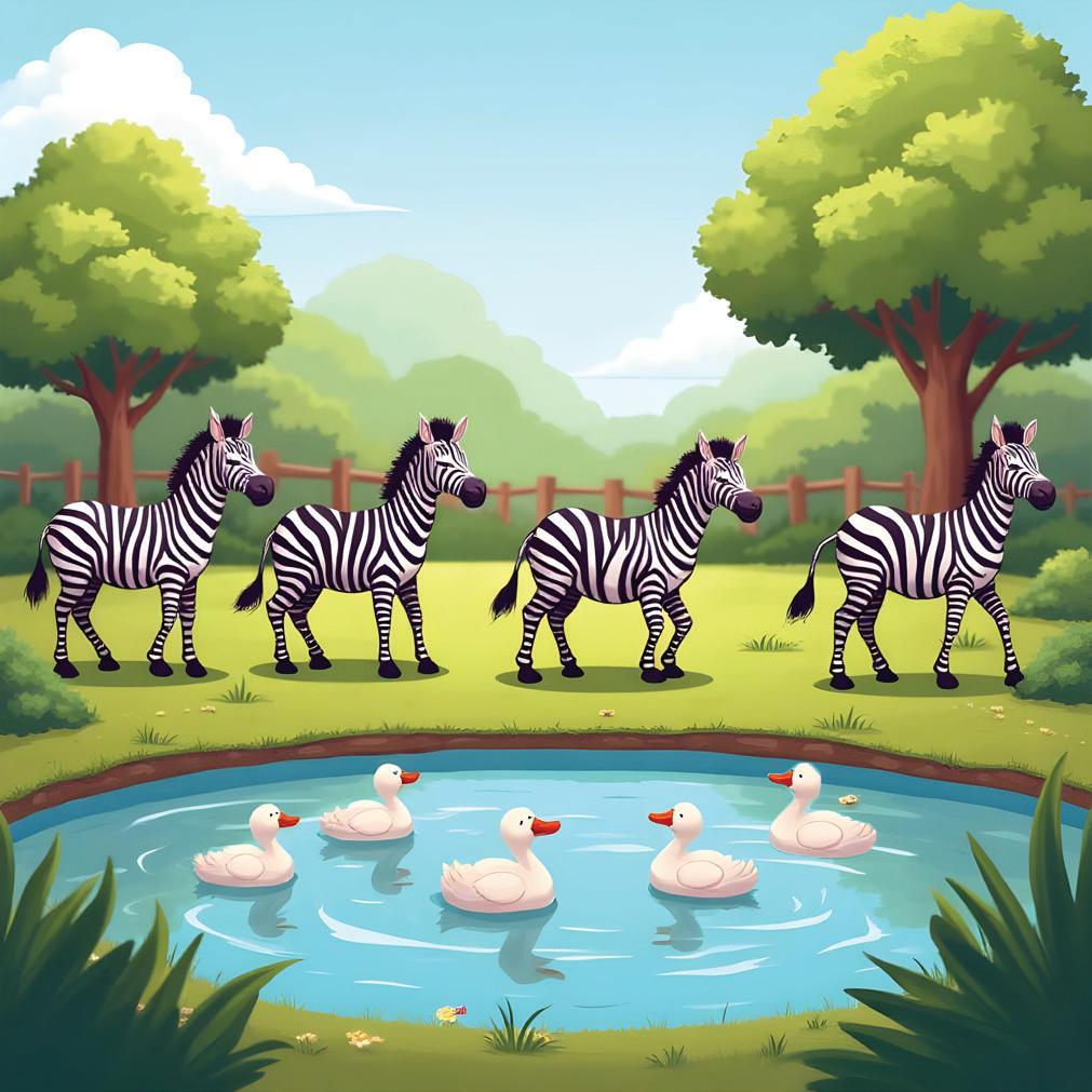 Siya saw 4 zebras walking on the grass. She also saw 5 white ducks in the pond.