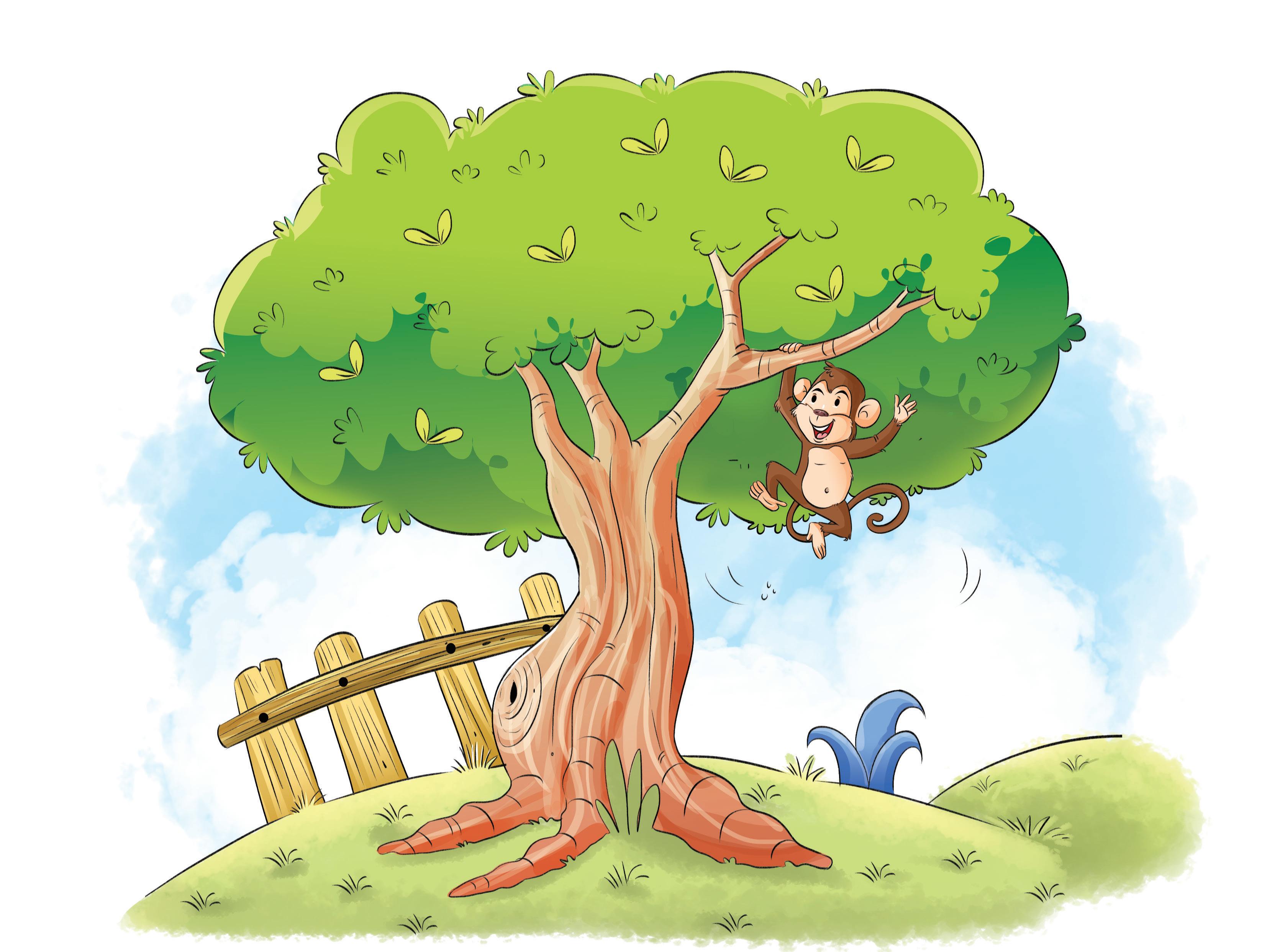 Uncle with an umbrella and squirrel up the tree, Let us sit together with mouse under the tree.