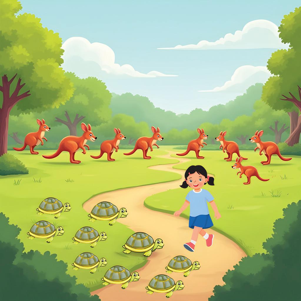 8 kangaroos hopped around. Siya walked with the 9 turtles.