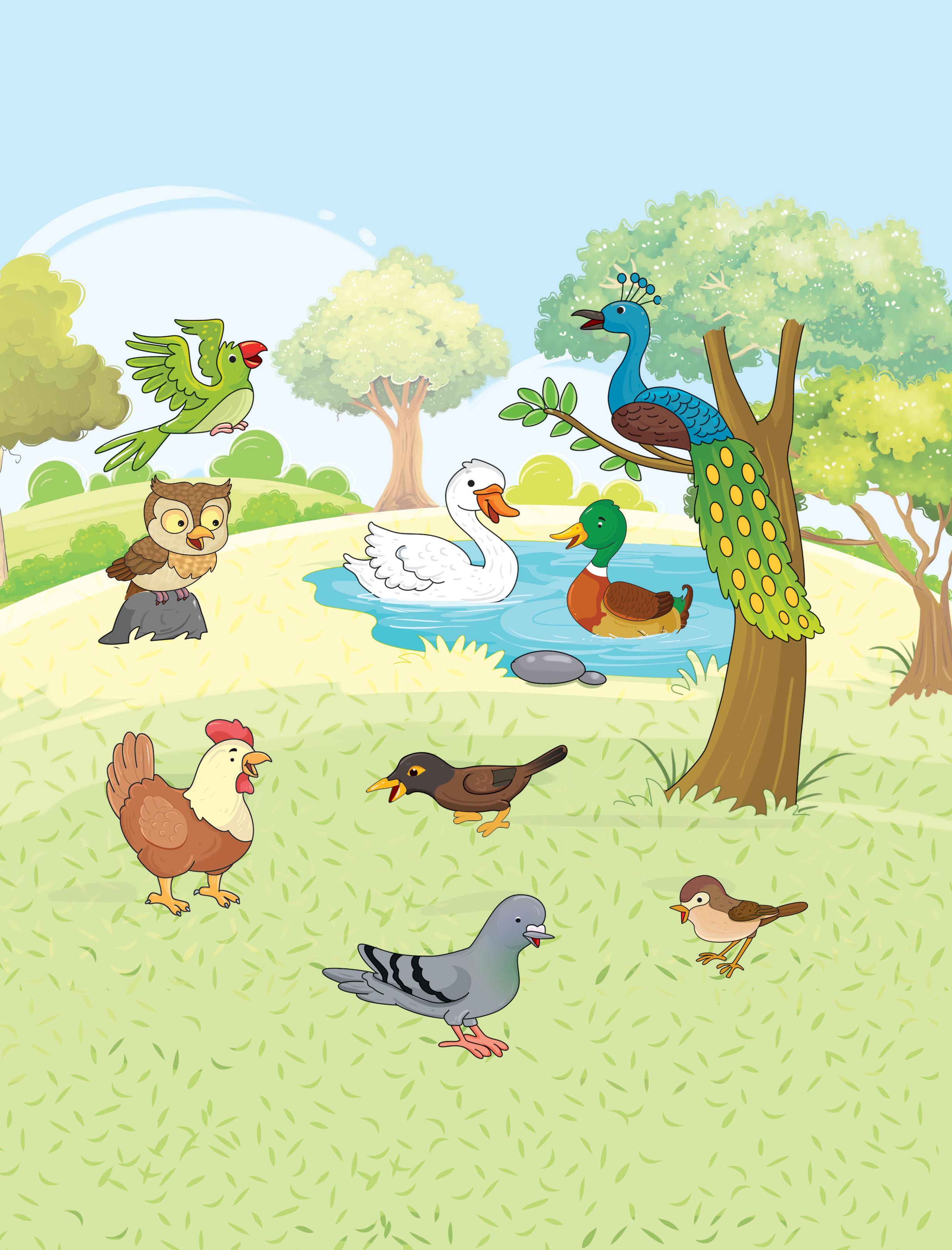 We see lots of colourful birds flying in the sky. Let us look at their pictures and say their names aloud.