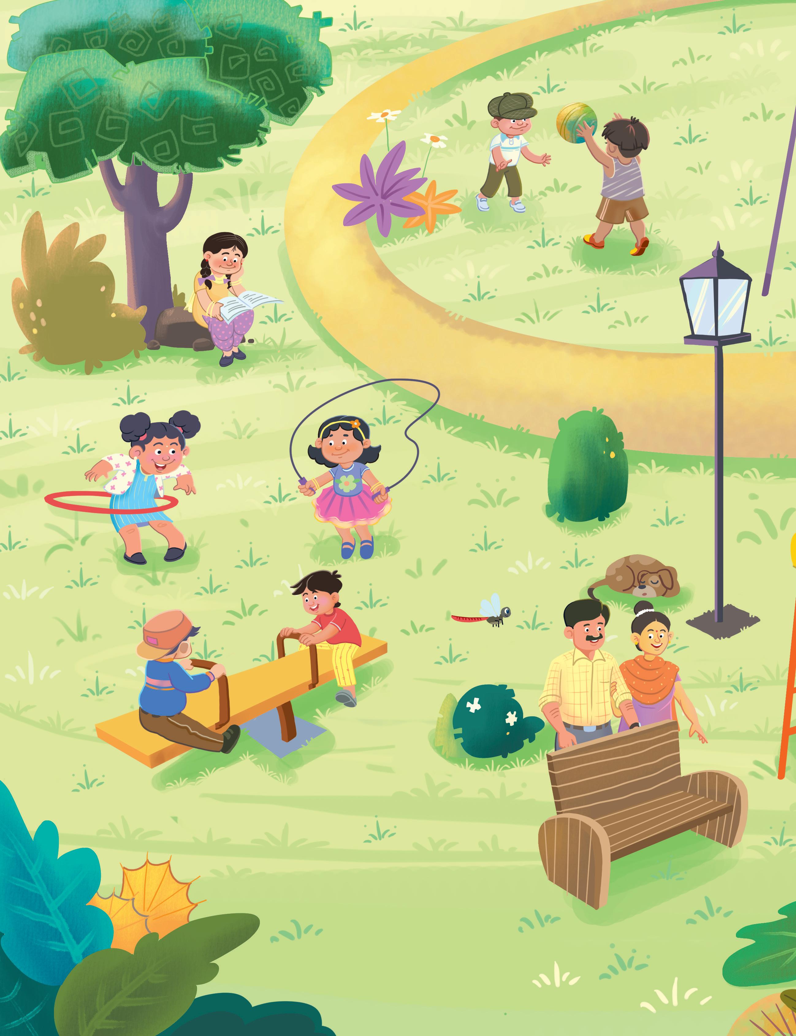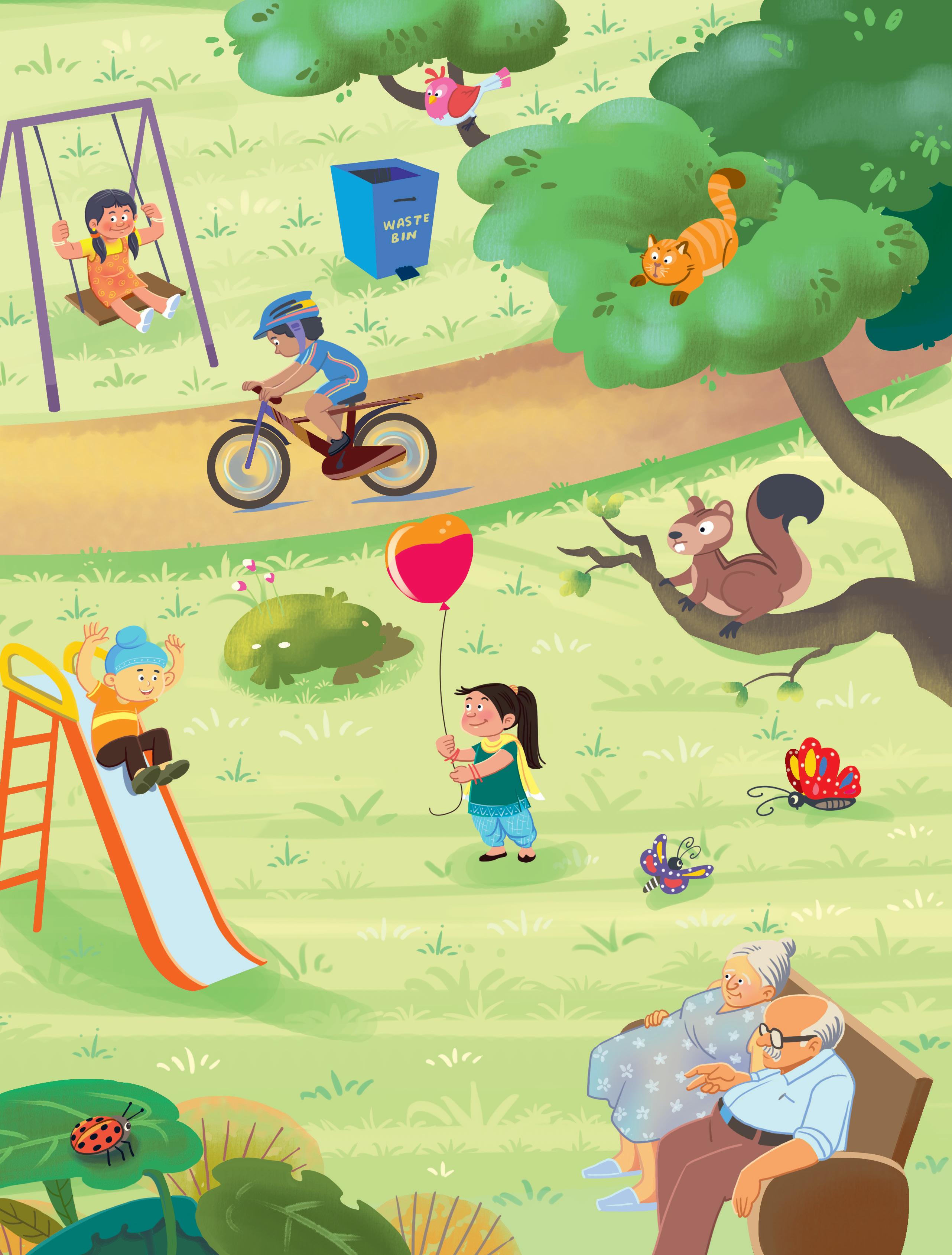 Ask children to name the things they see in a park, like trees, birds, flowers, swings, etc.