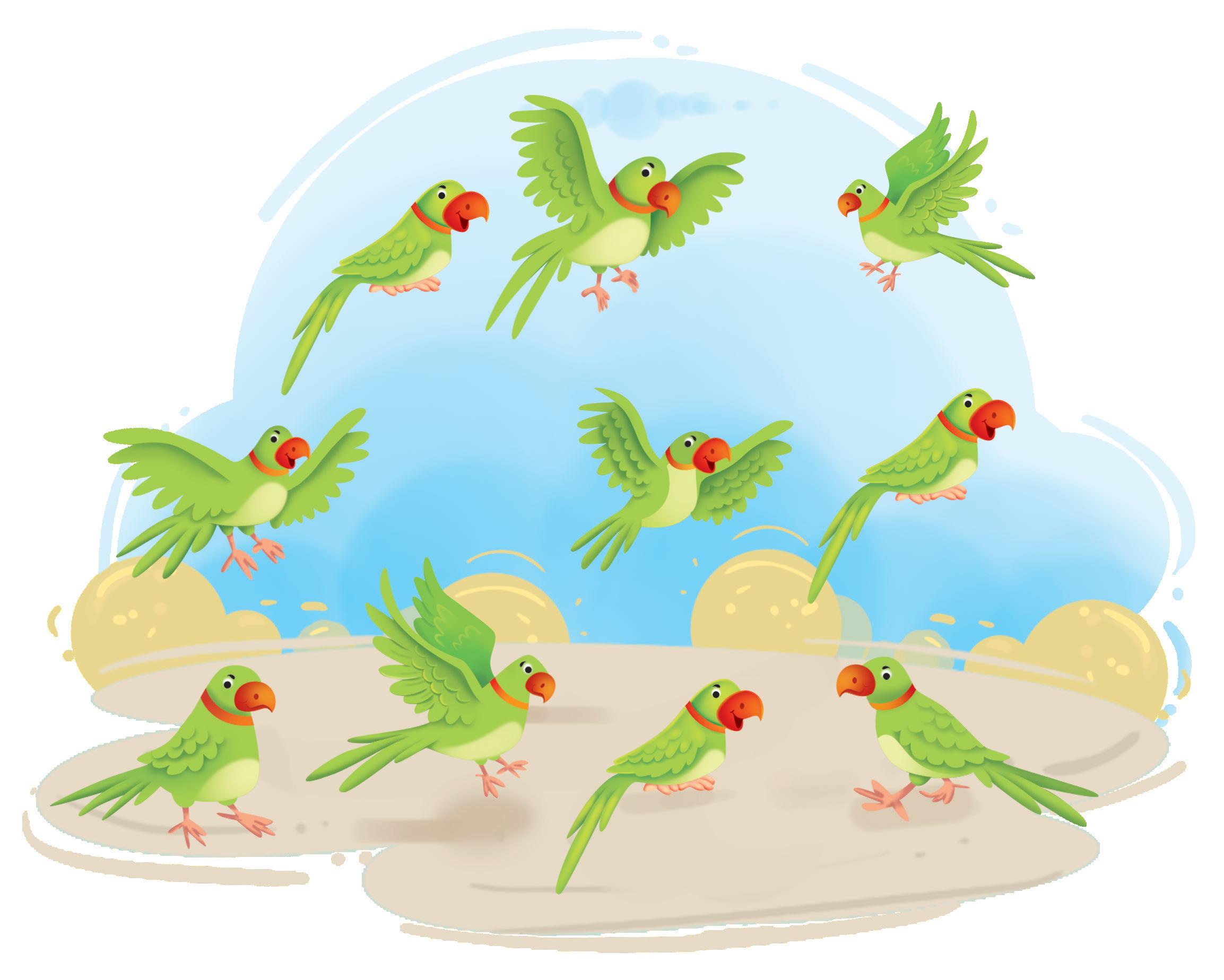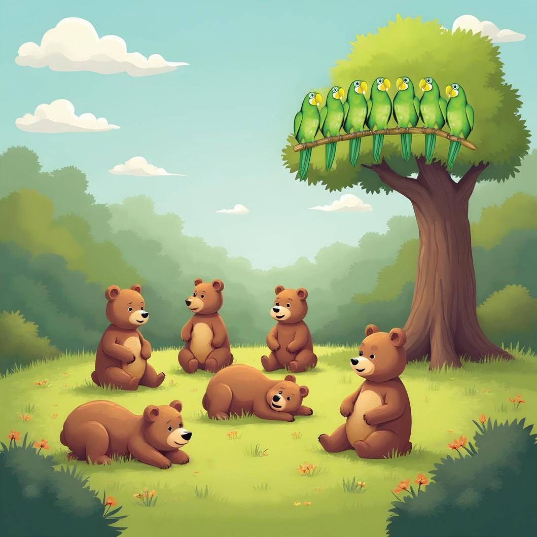 Siya saw 6 bears playing with each other. Up in the trees, 7 parrots sang a sweet tune.