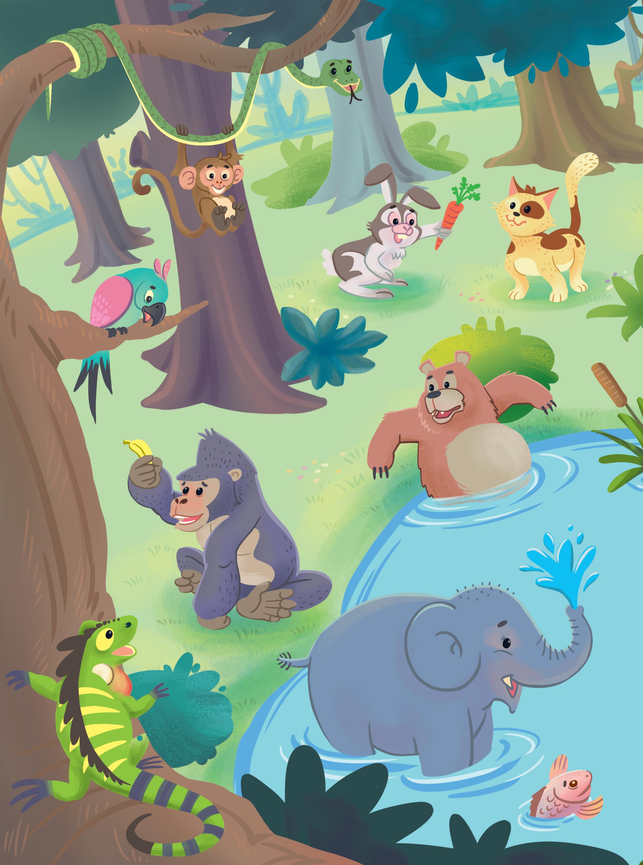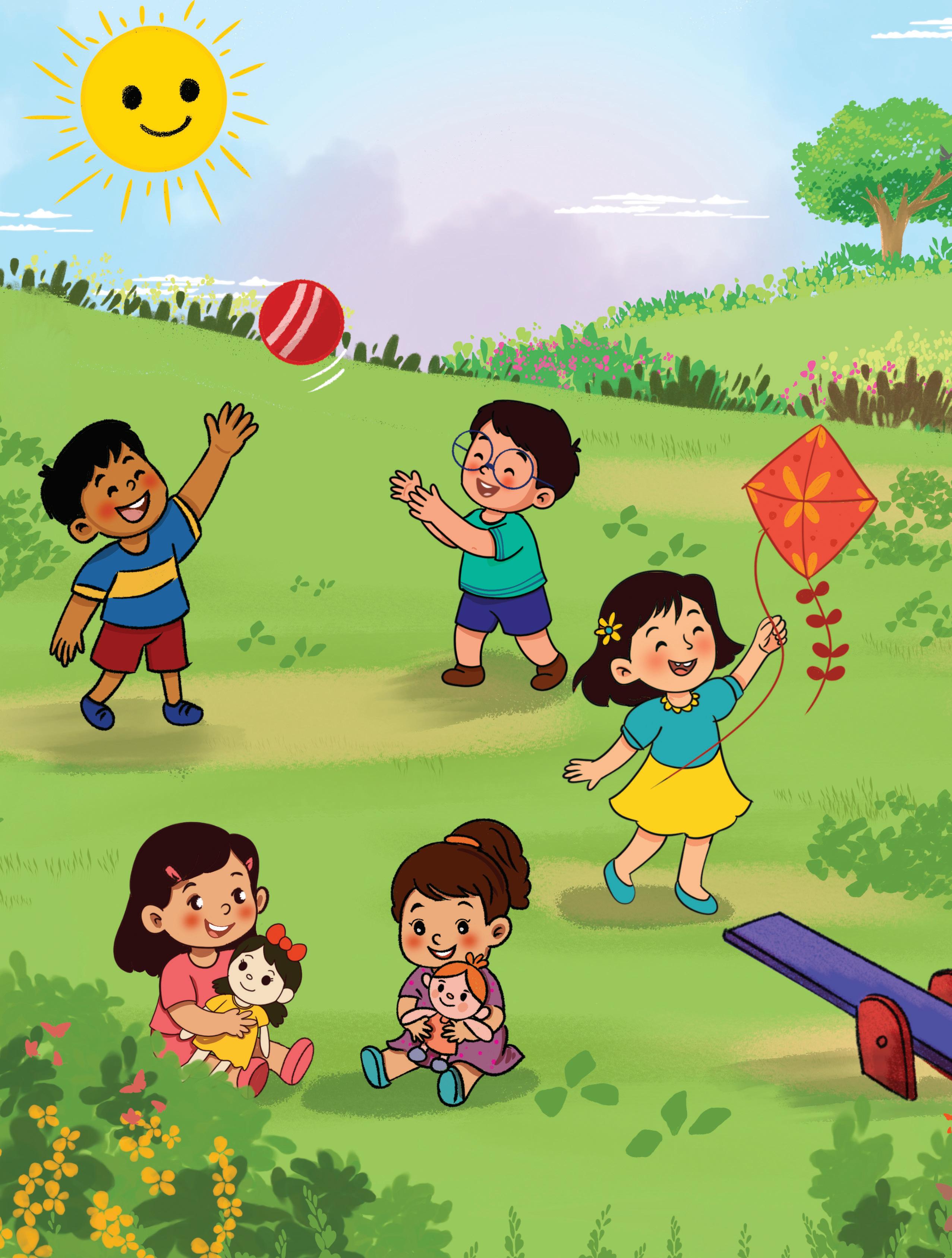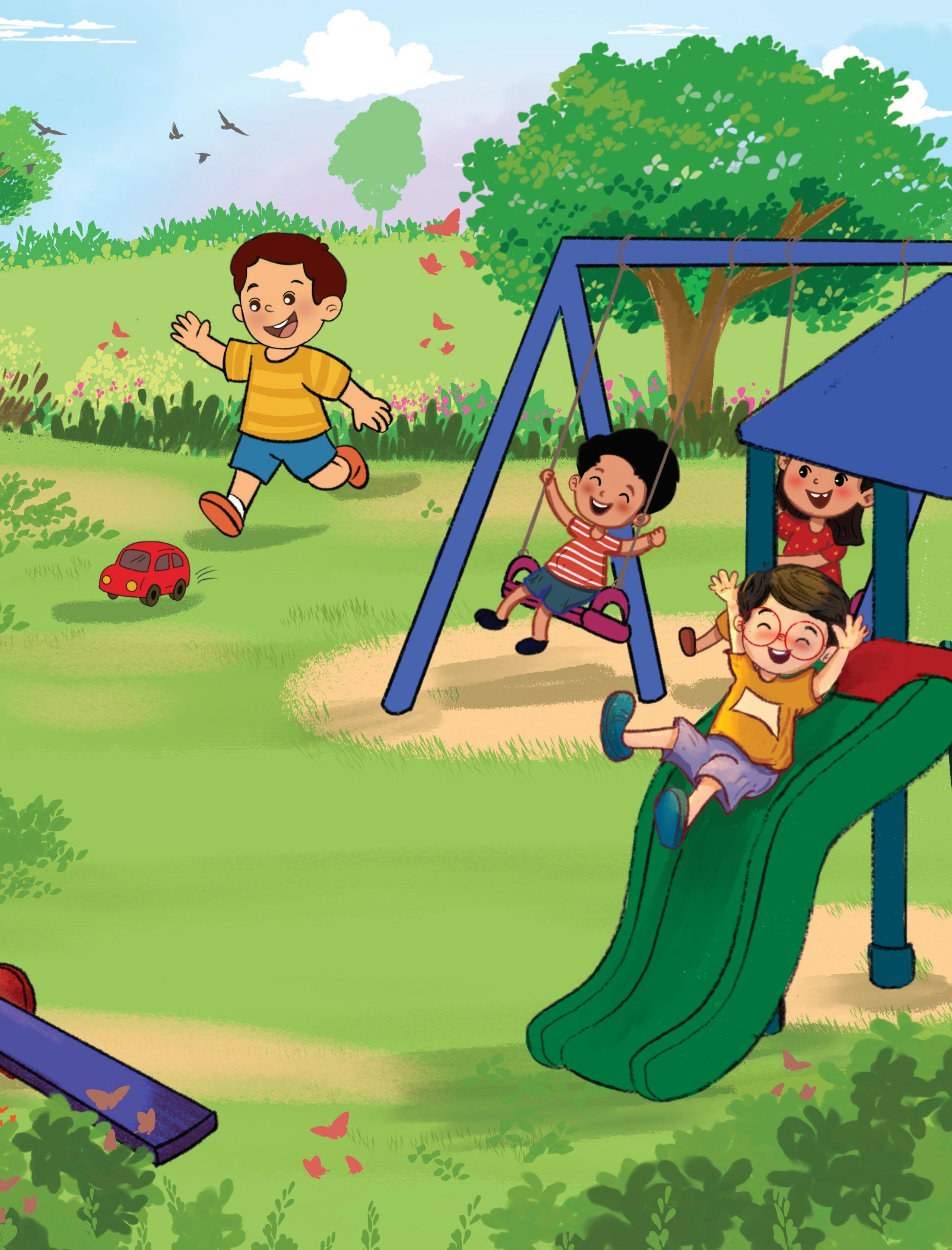 We run and jump, we laugh and cheer, I hug my toy, I hold it near. We swing, we slide, we shout, hooray! The park is fun, we love to play!