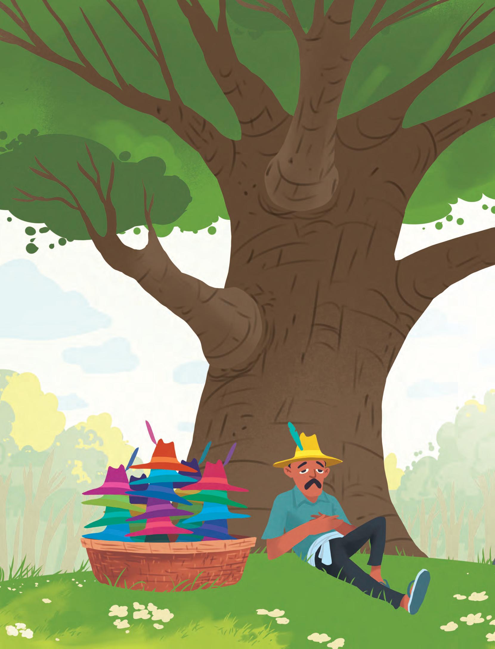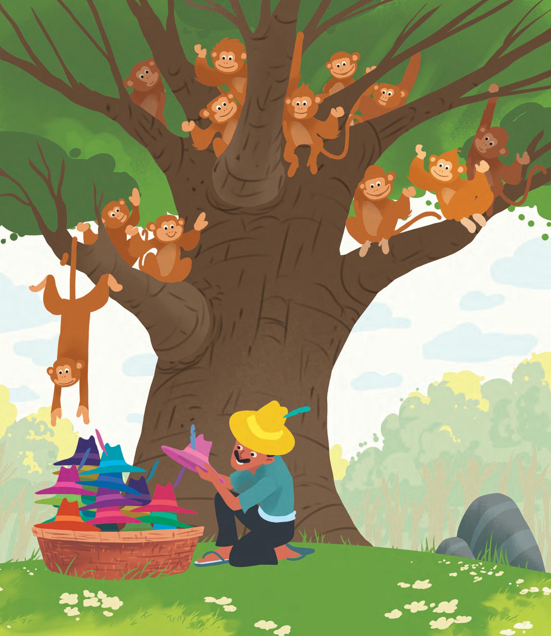 One day, a tired cap seller rested under a large tree. But the tree had many monkeys!