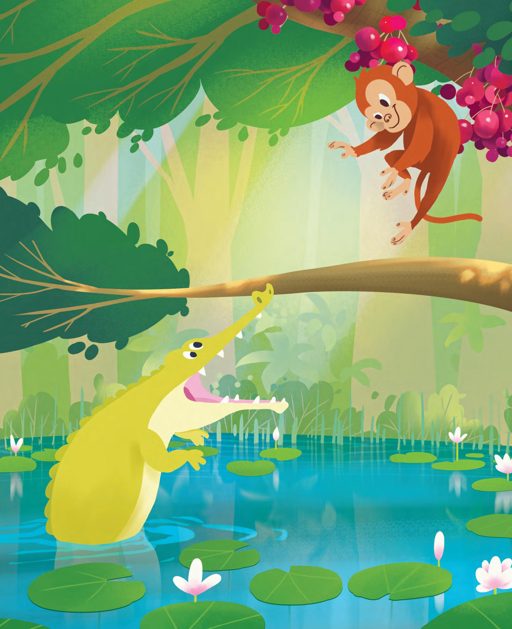 Once upon a time in a forest, there was a clever monkey called Miko. He was picking juicy fruit. He saw a crocodile named Kavi in the river.