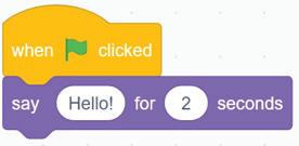 2 Drag the say Hello! for 2 seconds block from the Looks category and join it with the when green flag clicked block.