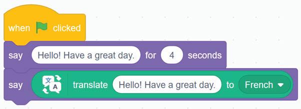 9 Now, drag and drop the translate () to () block inside the say () block. Now, type the same message “Hello! Have a great day.” in the translate () to () block.